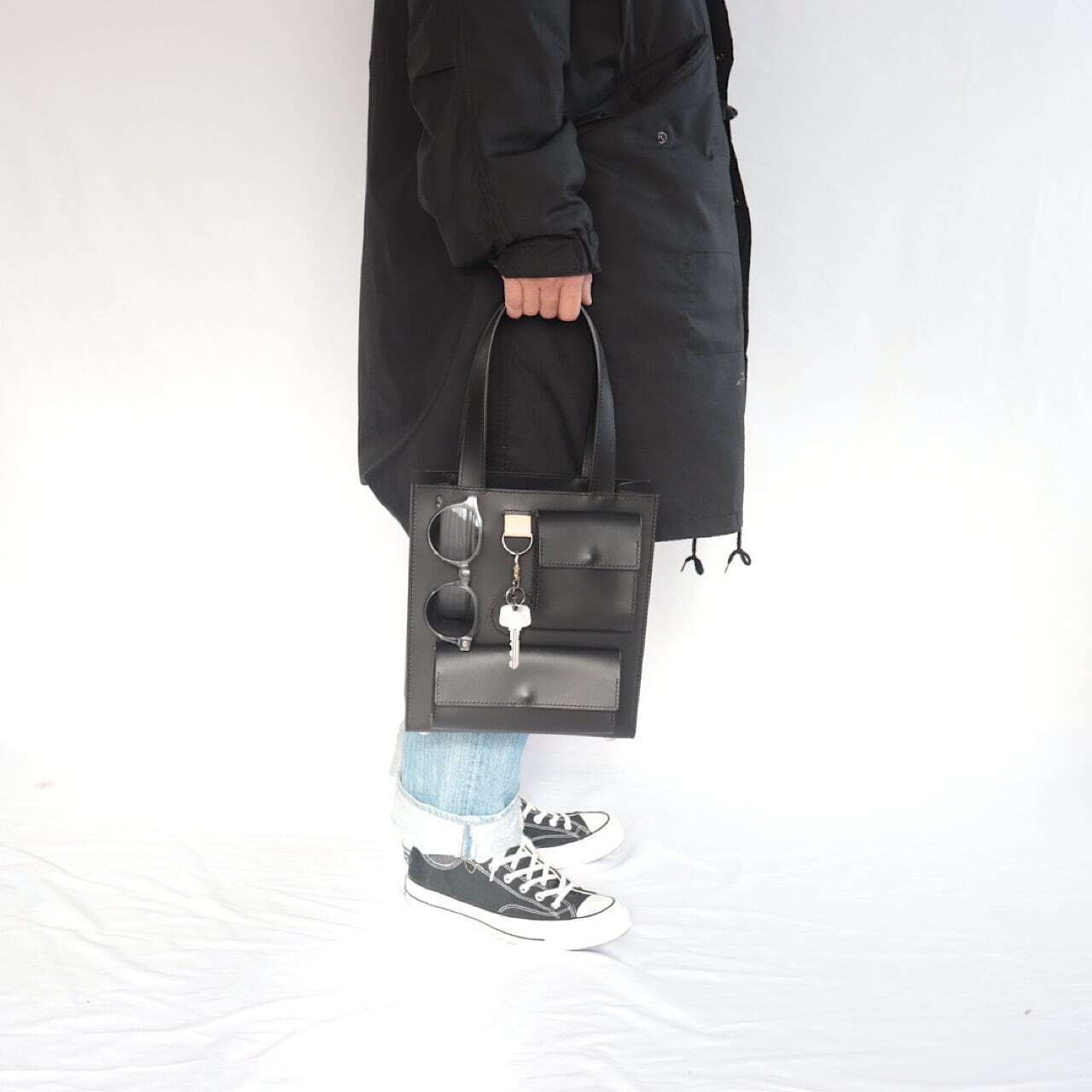また、コンパクトながら収納力のあるバッグで後々ご紹介させていただきますが表面の収納を利用することでビジュアルに変化が生まれ一味違う印象を生み出します。
