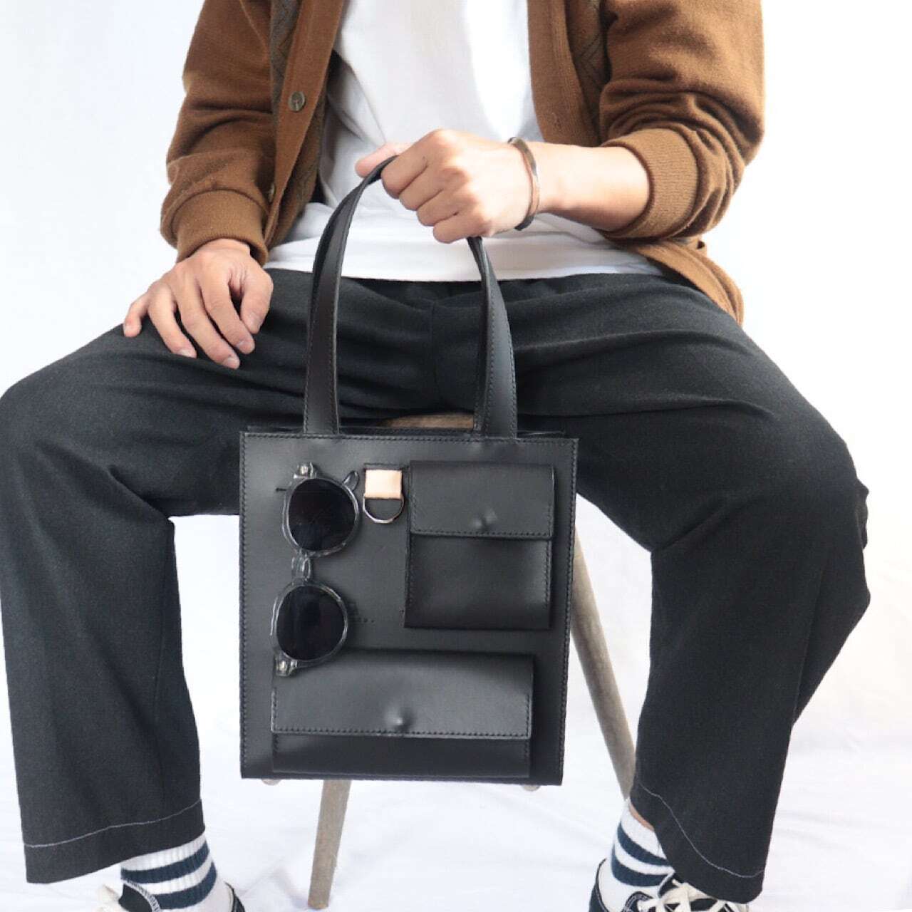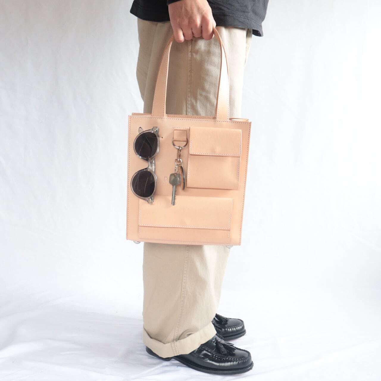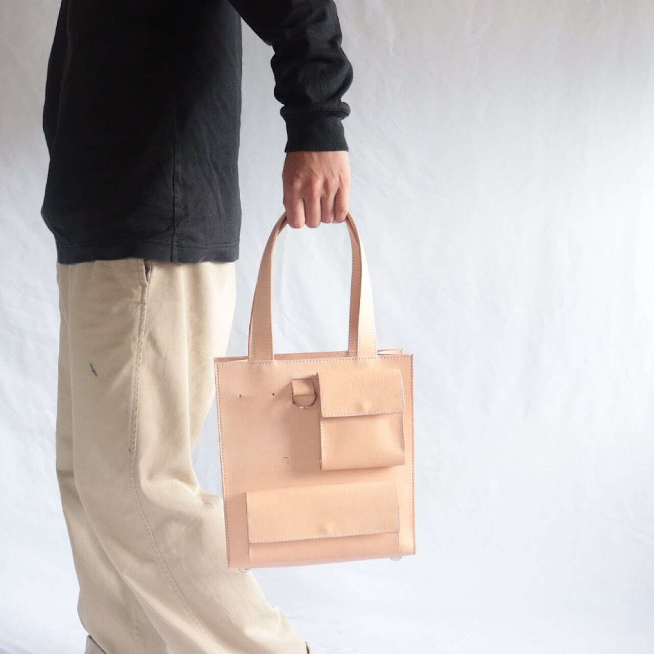 また、手持ちの際は足元の低い位置にバッグが来るのでパンツのお色にアクセントを加えてくれます。
