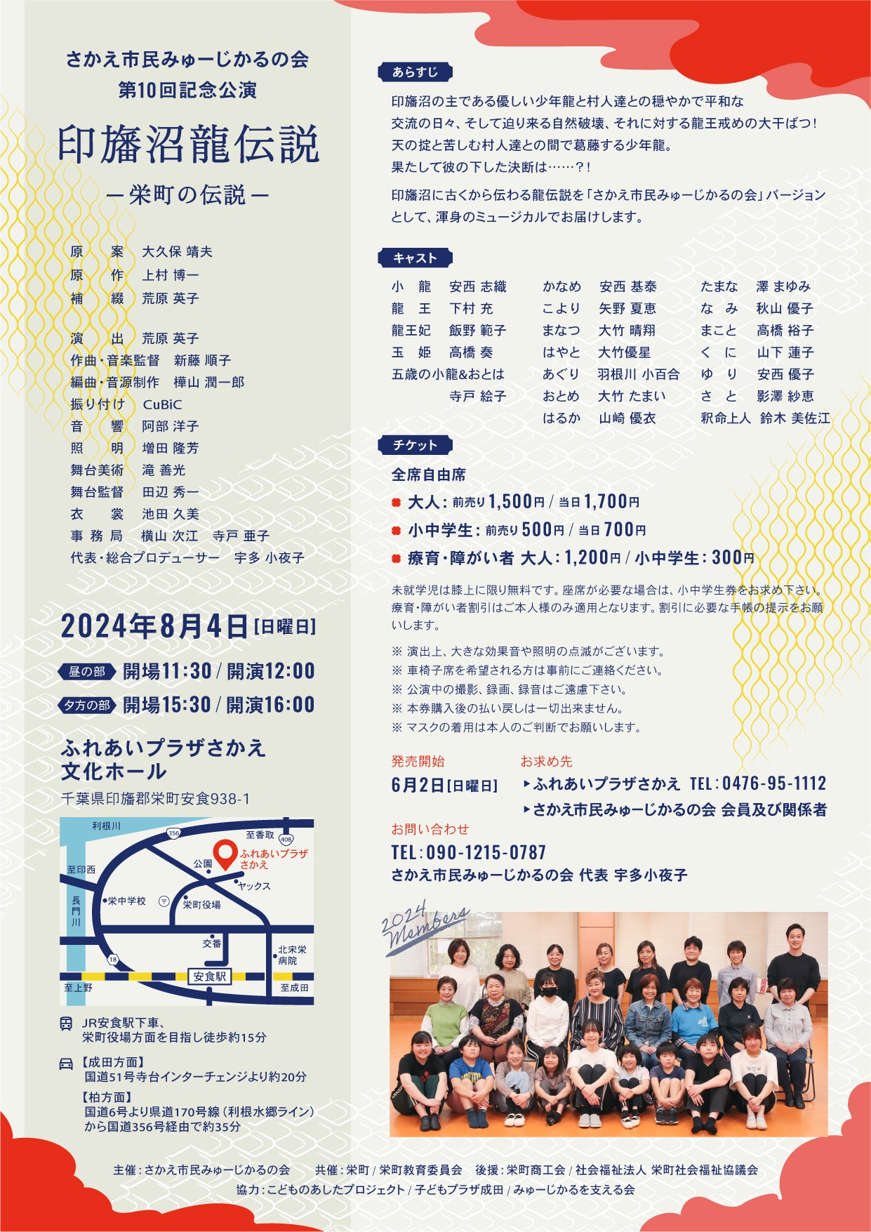 印旛沼に古くから伝わる龍伝説を「さかえ市民みゅーじかるの会」バージョンとして、渾身のミュージカルでお届けします。