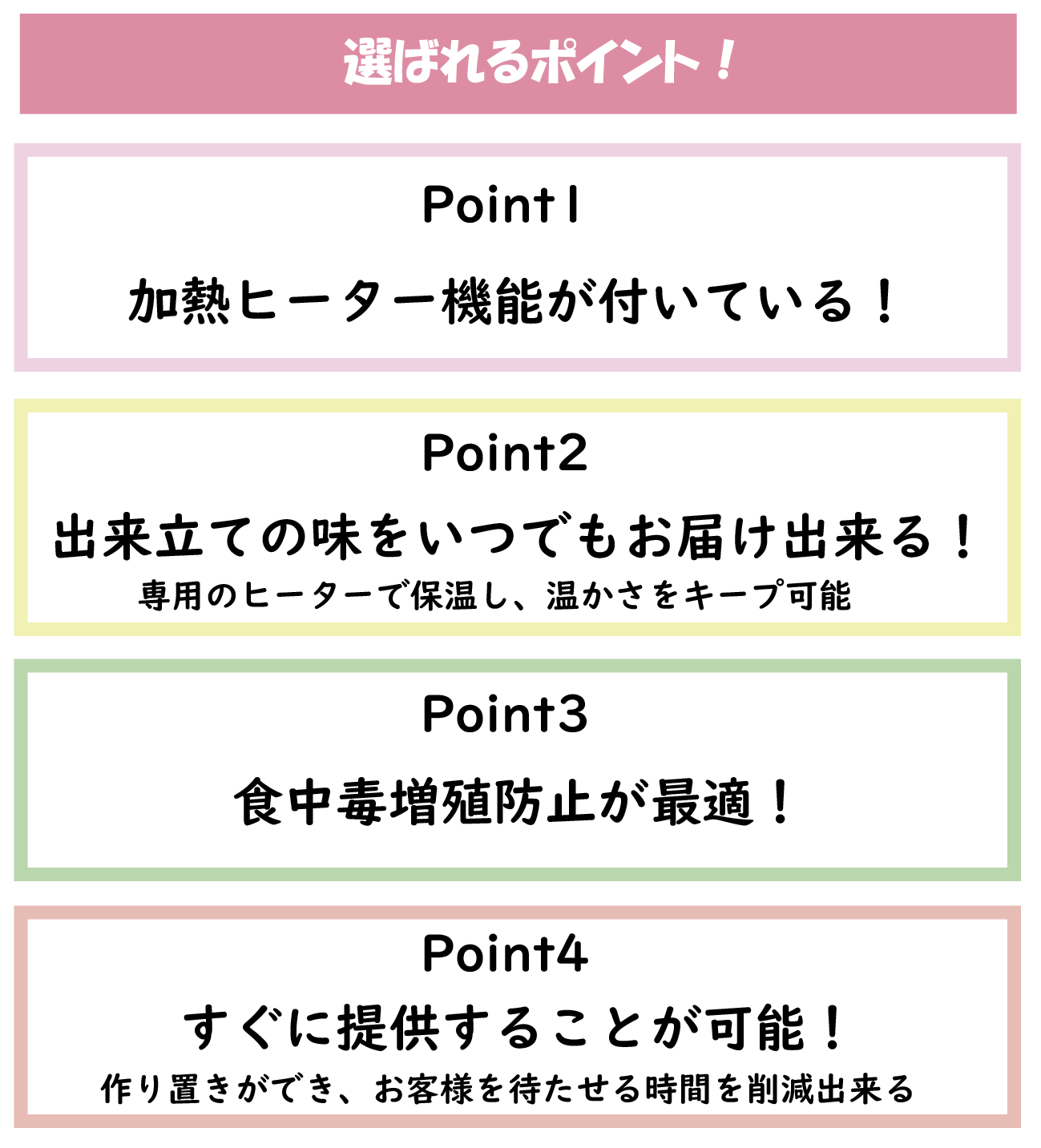 デリバリー業界でよくある「遅い」「ぬるい」「態度が悪い」というクレームに対処するために、新しい企画を立ち上げました。「遅い」「ぬるい」は顧客満足度を下げるだけでなく、食中毒のリスクも高めるため、これらの問題を解決する製品を開発しました。自社で配達を行う飲食店にとって、この製品を使えば、複数の配達先に同時に出発しても、食品を温かく届けることができ、配達の遅れもなくなります。食中毒の増殖を防ぐ高温で提供できるため、デリバリービジネスはもちろん、大切な人への食事提供にも安心して使えます。これまでのような冷めた食事ではなく、温かくて美味しい食事を提供できることに自信を持っています。