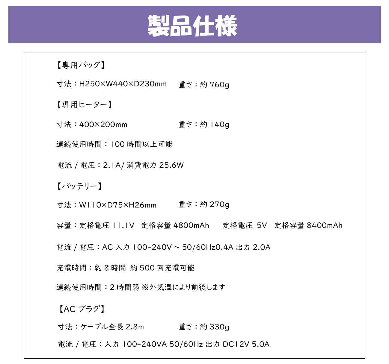 A.バッグ+ヒーター1枚+バッテリー1個で約1.2kgと軽量設計となっております。