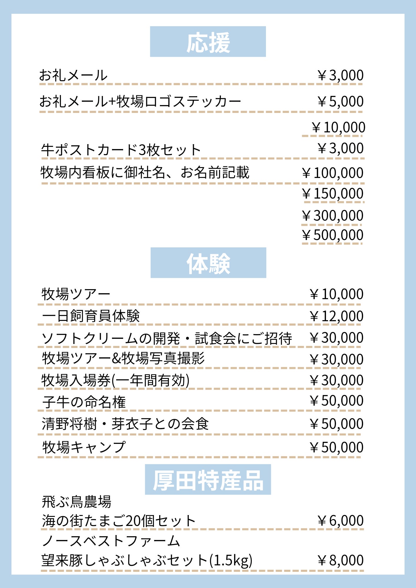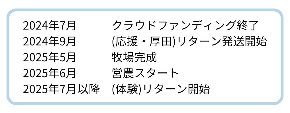 2026/04/02 13:51こんにちは!長らくお待たせしておりました、牧場体験メニュー(牧場ツアー、牧場ツアー+牛との写真撮影、一日飼育員体験、牧場入場券)の受入れ準備が整いましたので、ご支援謝様へメッセージをお送りいたしました。現在は生まれたばかりの子牛もおりますし、牧場へお越しいただくにはちょうど良いタイミングかなと思います。皆様からのご連絡を心よりお待ちしております! もっと見る