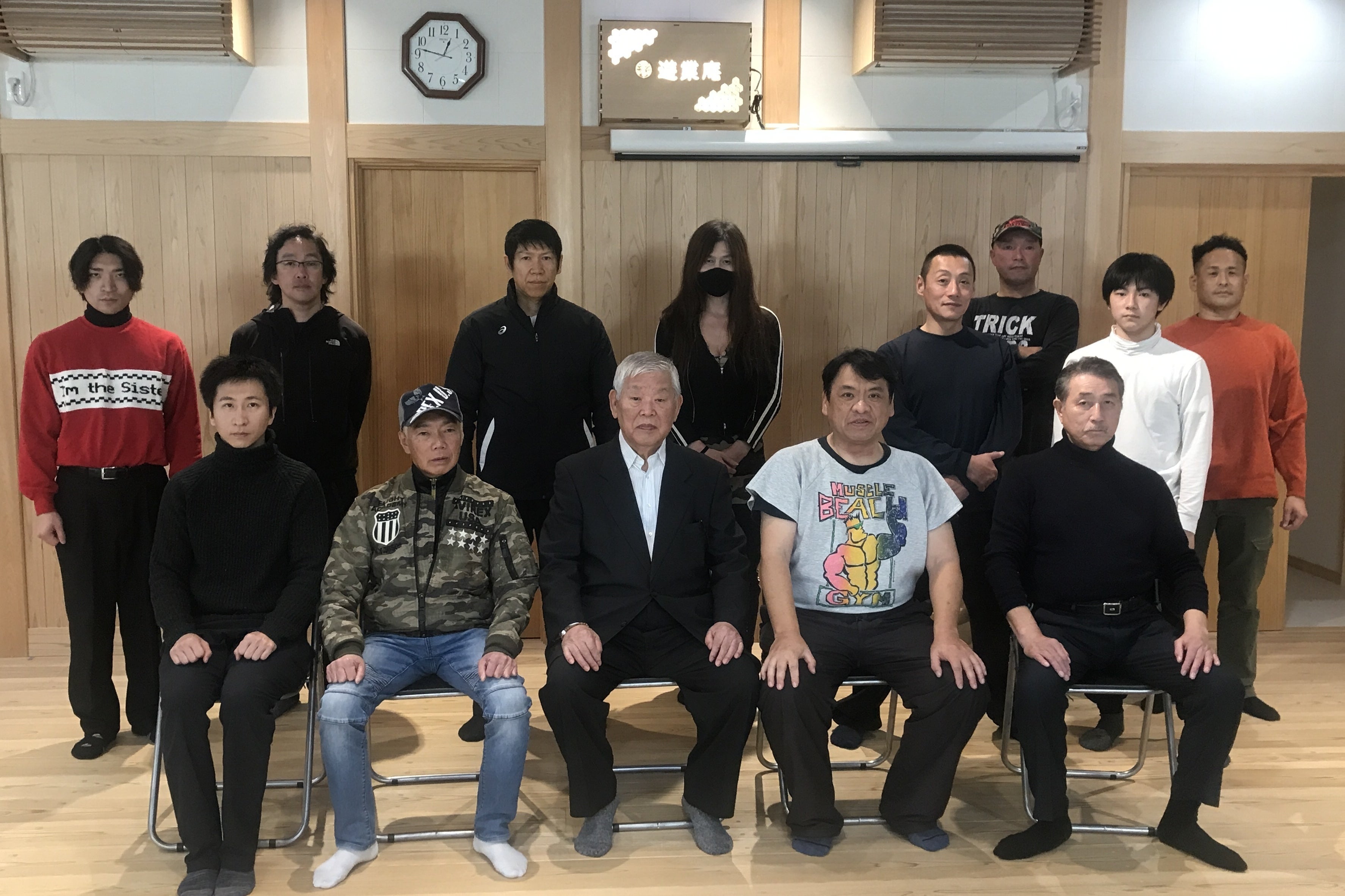 鬼山火山(写真中央) 演者 染野行雄 ✴︎写真左右は空手セミナー参加生徒と美剣疾風