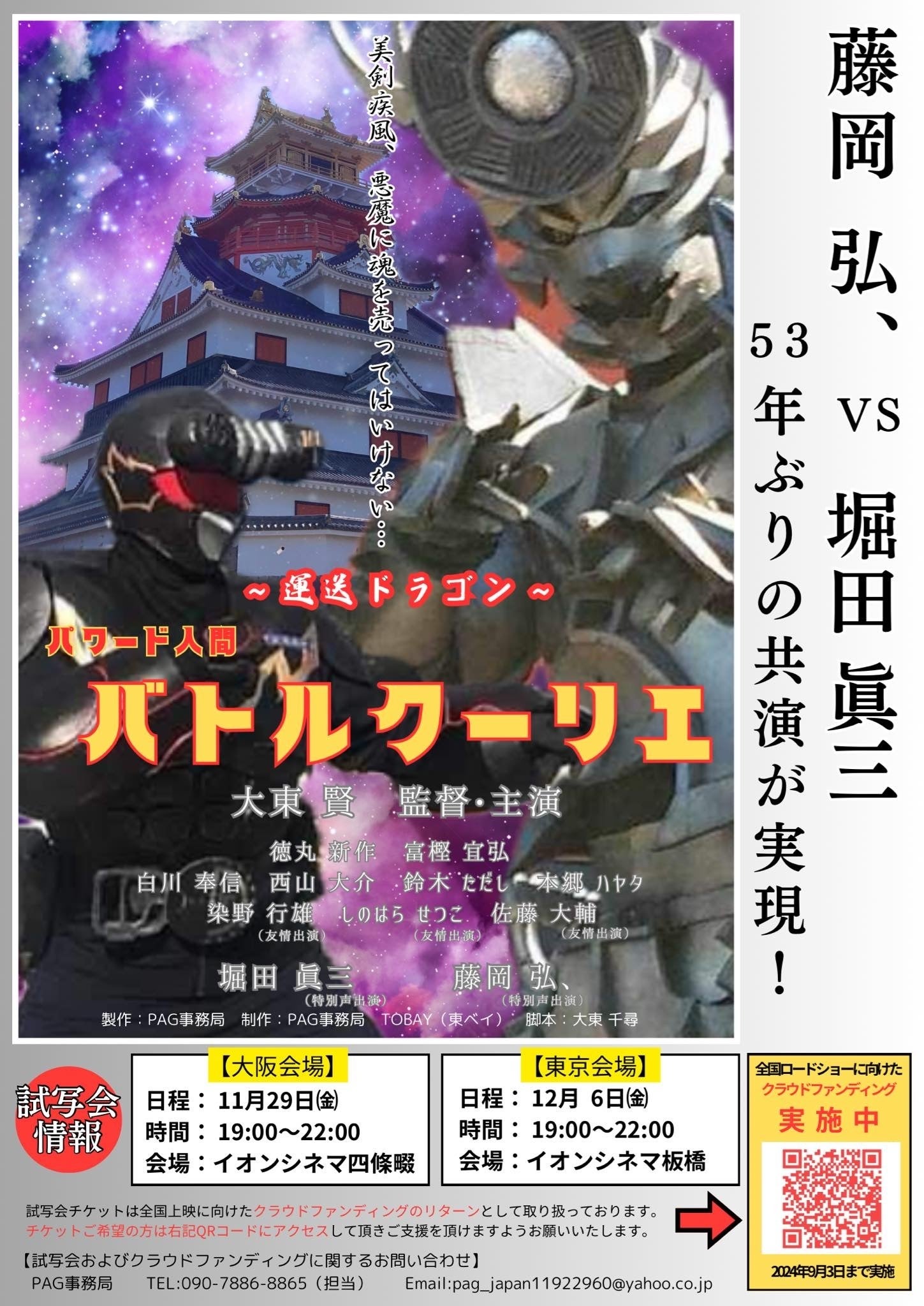 その他、ボディビルチャンピオンや有名殺陣師、世界空手支部の総帥など、そして、試写会の会場となる東京と大阪の施設とも協議を進め、ほぼ全ての準備が整いつつあります。しかし、全国での上映を実現するためには、さらなる財政的支援が必要です。