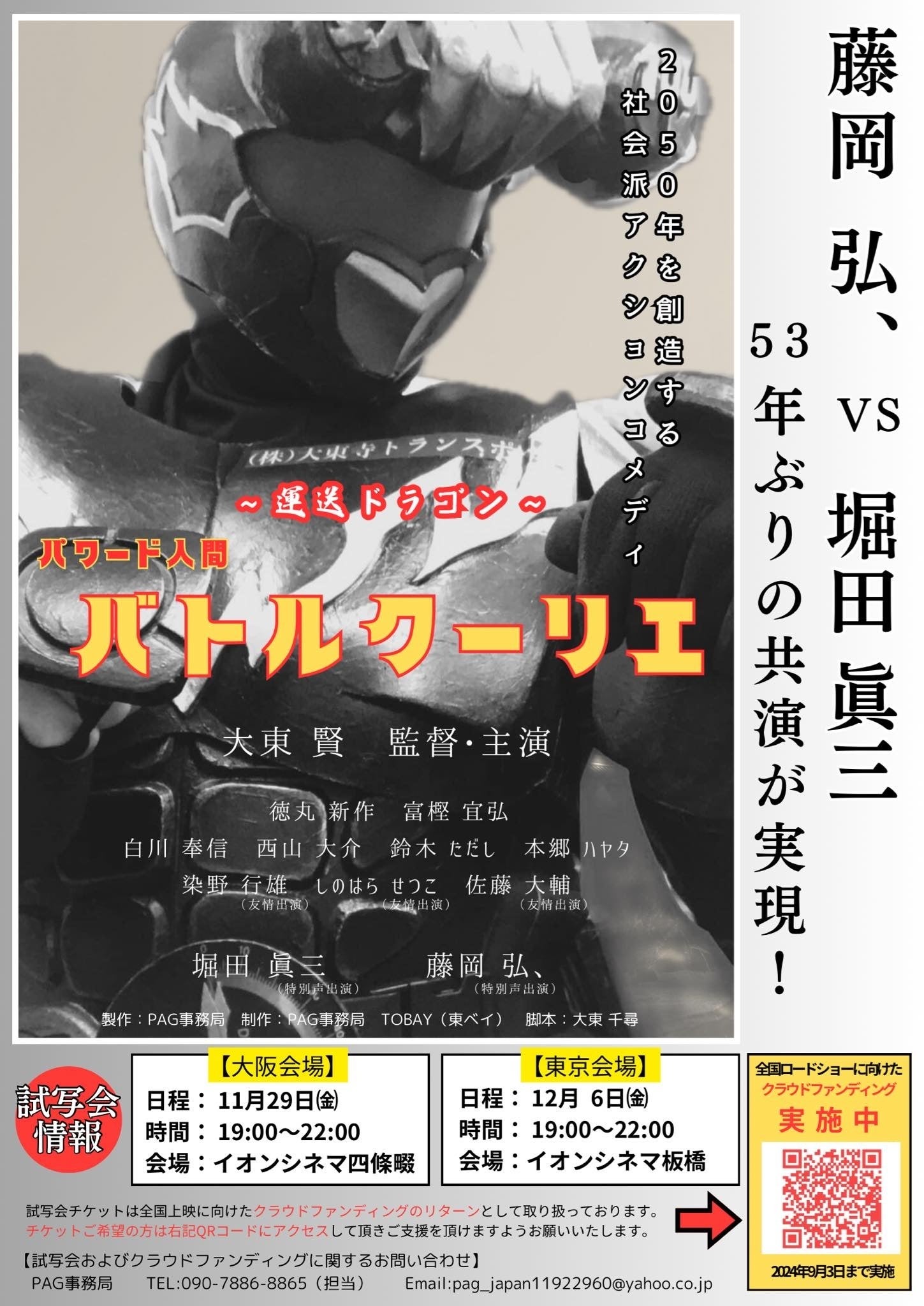 2025/02/12 12:59PAG事務局 パワーアクショングロウは映画~運送ドラゴン~パワード人間バトルクーリエの全国ロードショー公開劇場を公表しました。当映画の大東賢監督の生まれ育った関西からという事で、大東賢監督の大ファン、ブルース・リーのショップが並ぶ、南京町近く、神戸の元町映画館より公開されます。その後、関西では扇町キネマ、ならまちシアター青丹座、関東ではシネマノヴェチェント、シネマハウス大塚、成田HUMAXシネマズ等で上映が決定しています。 Feature異色の映画監督、アームレスリングの元日本王者、アクション俳優の大東賢がメガホンを握り、特撮ヒーロー作品のラスボス的存在の藤岡弘、堀田眞三が声優出演して話題となり、2024年の11月29日に大阪のイオンシネマ四條畷と12月6日に東京のイオンシネマ板橋で 試写会&舞台挨拶が開かれ、大盛況で幕を閉じました。 Story 作品の舞台は西暦2050年の日本。総人口が100億人を突破した人類は食料や水資源、エネルギーの供給を維持するため月面へと進出。そんな宇宙事業が軌道に乗り、人類が新たな歴史を刻んでいた頃、ゴッハイ(誤配)を名乗る闇の武装勢力からの攻撃が始まる。大東寺トランスポート、アルバイト配送員の美剣疾風は社長命令で、安物のパワードスーツを身にまとい、ゴッハイや地球侵略を目論む宇宙人との戦いに挑む。 Introduction劇中で描かれる誤配やパワハラ、ドライバーの高齢化や人手不足など、主人公の美剣が経験し、見聞きする受難の数々は、アクション俳優をしながら運送業のアルバイトで生計を立てていた監督の実体験を随所に盛り込んだもの。リアルに描かれた配送員の悲哀や奮闘ぶりは必見だ。安物のパワードスーツが与えられ、戦いを無理強いされる美剣の姿は、低賃金かつ長時間労働にあえぐ労働環境を想起させさえする映像が展開される。 ~運送ドラゴン~パワード人間バトルクーリエ 予告編https://youtu.be/IIjsFNLBNjo ~運送ドラゴン~パワード人間バトルクーリエ 公式ホームページhttps://pagjapan11922960.wixsite.com/website-2 もっと見る