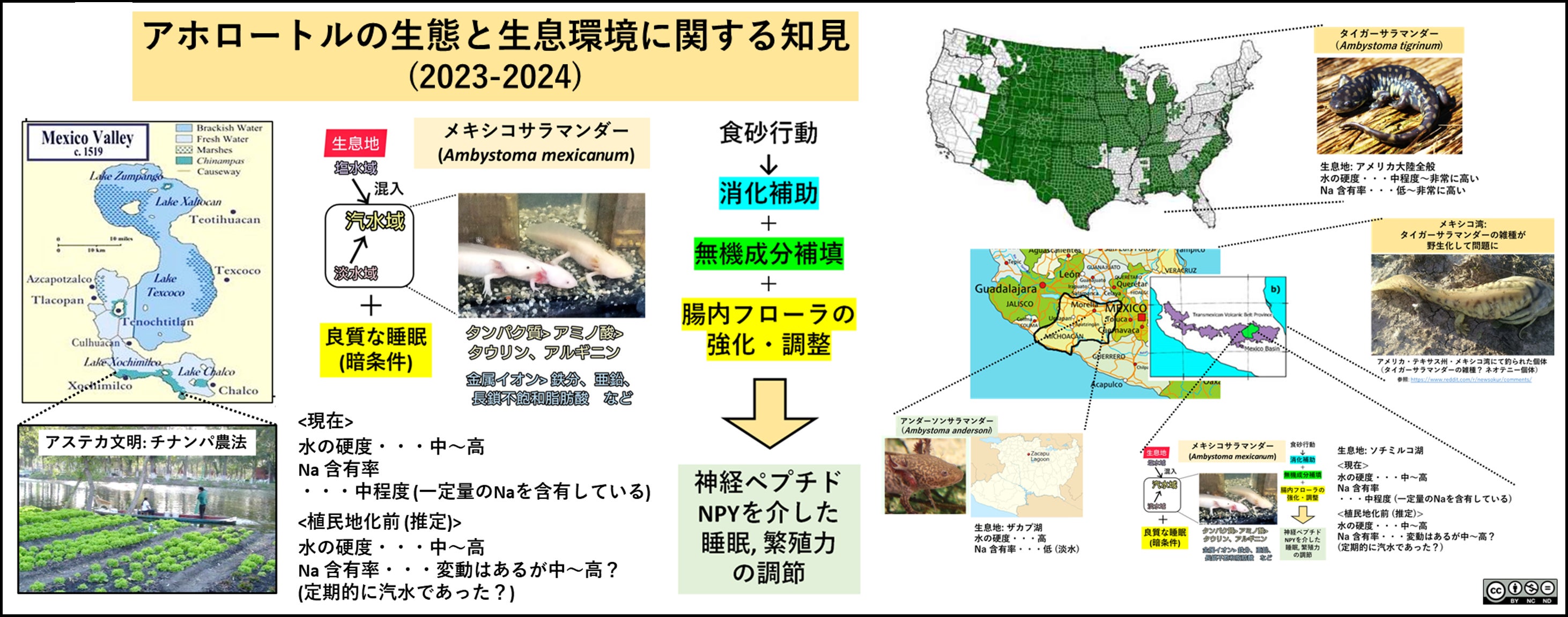 1. 彼らがかつて繁栄していた時代の生態について理解するため、生息地であるメキシコ・ソチミルコ湖の環境に注目し、当時の環境と現在に至るまでの環境の変遷 (植民地化→土地開発・観光地化→水質汚染) について明らかにする。