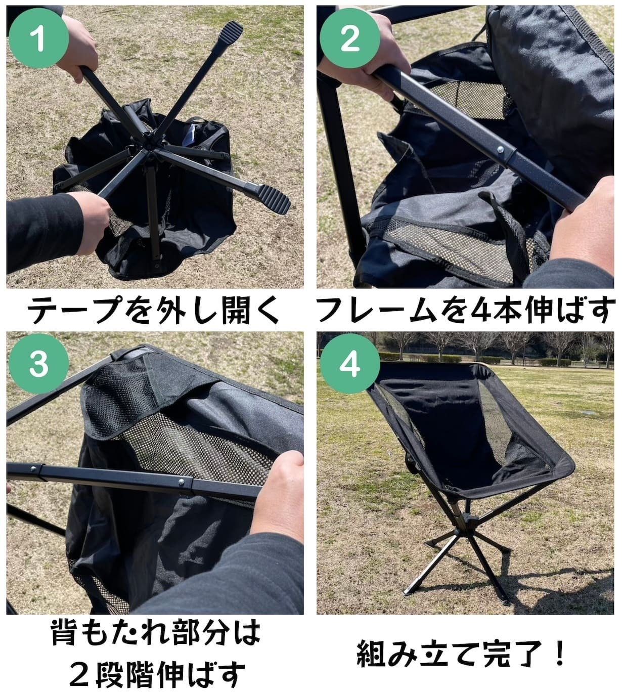 気軽に持ち歩けて、フレームシート一体型で開いて伸ばすだけ数秒で組み立てできる360度ぐるぐる回転するポータブルチェア!