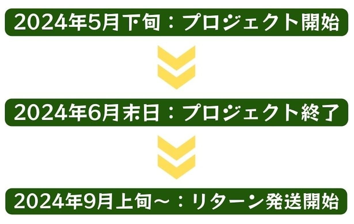 ※原則として、配送遅延に伴うご支援後のキャンセルはできませんが、リターン配送予定月から3ヶ月を超えた場合には、希望者に限りキャンセルにて対応させていただきます。