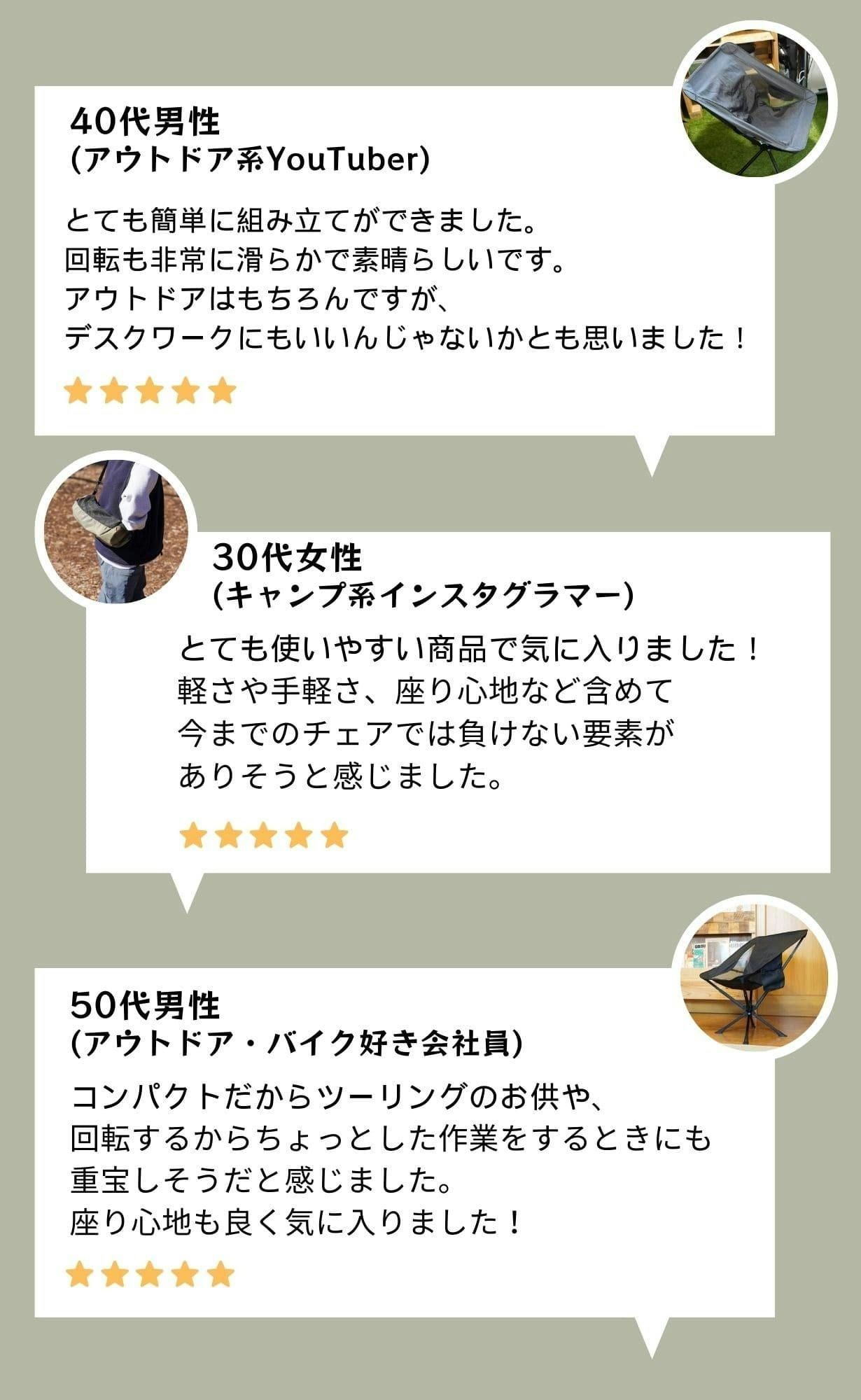 ポータブルアウトドアチェア【GuruGuru Chair】 の試作品をご使用していただいたところ、多くの方に高い評価をいただきました。(抜粋、一部修正)