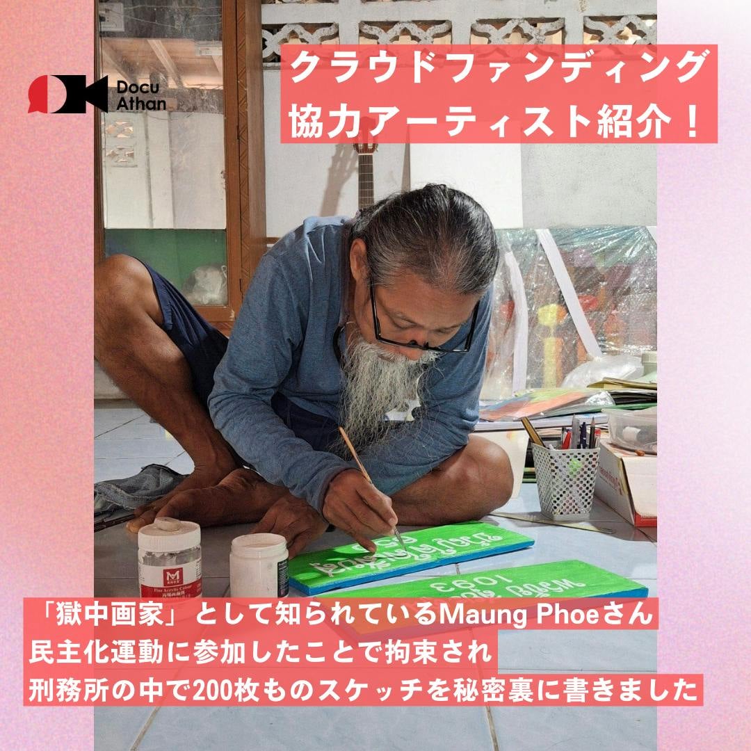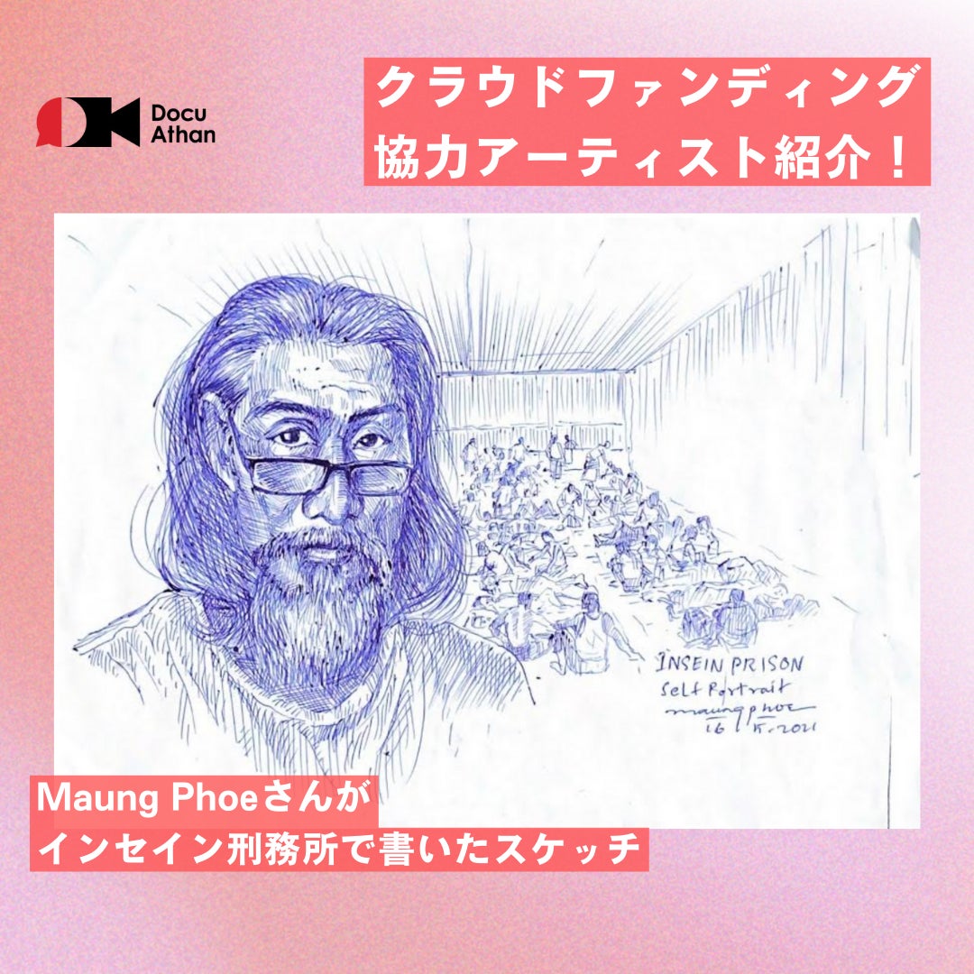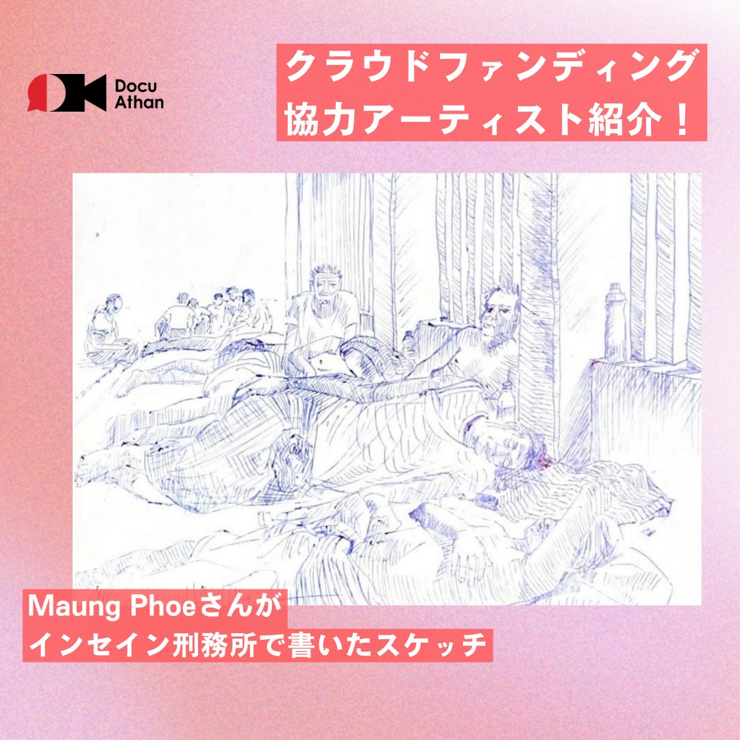 この作品を提供してくれたのは「獄中画家」として知られているマウンポー(Maung Phoe)さんです。民主化運動に参加したことで拘束されましたが、刑務所の中でスケッチを秘密裏に書き続け、解放された際に持ち出しました。彼が獄中で書いた200枚にものぼるスケッチは、刑務所内部の劣悪な状況を示す貴重な資料となっています。