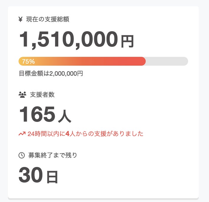おかげさまで、目標金額(第1ゴール)の75%を達成しました!165人もの方々からご支援をいただき、感謝の気持ちでいっぱいです。残り30日間も全力で駆け抜けますので、どうか拡散とご支援にご協力いただけると幸いです!