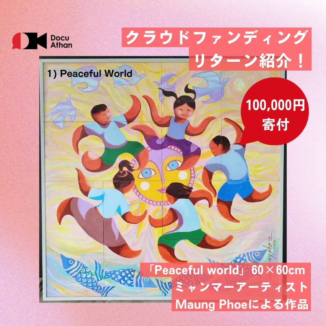 10万円ご支援の方へのリターンはミャンマー人画家による絵画のプリント作品 "Peaceful world" です。60cm × 60cm(他のサイズをご希望の方はご相談ください)