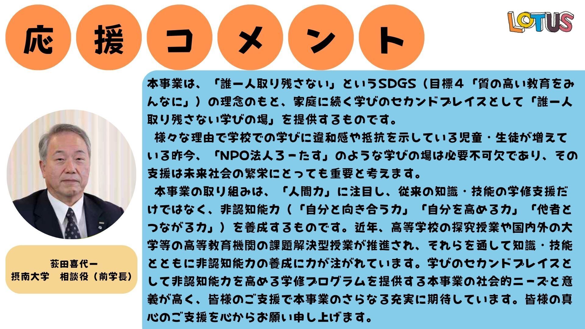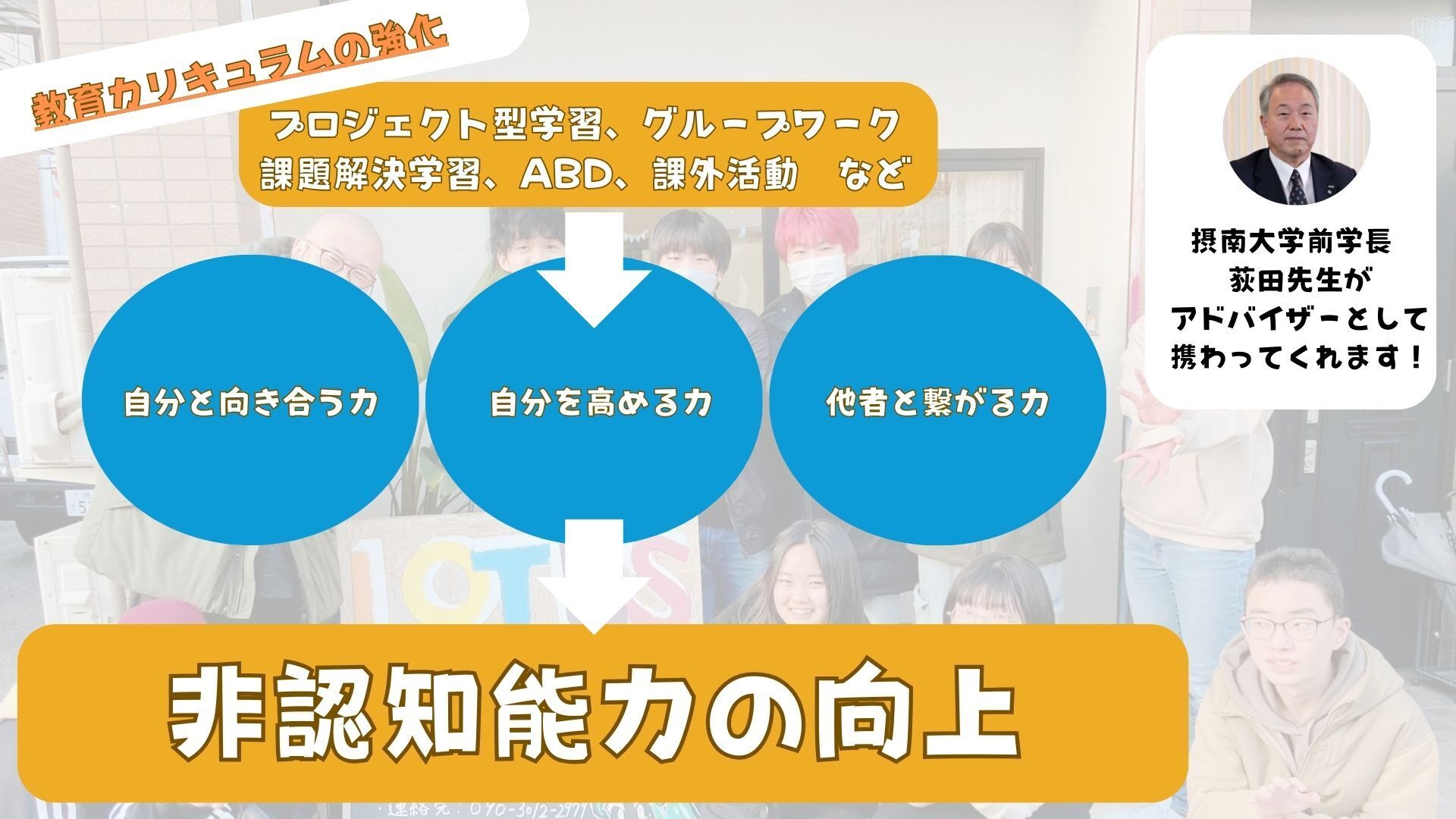 この度、アドバイザーに就任いただいた摂南大学の前学長のお力をお借りし、非認知能力を向上させる取り組みを行って参ります。