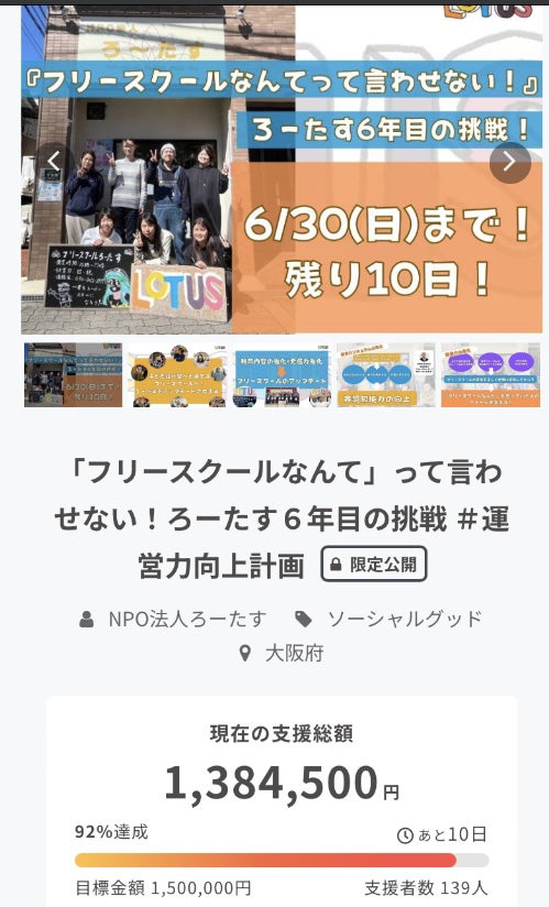 クラウドファンディング、昨日の23:59で無事に終了いたしました。最終的に180人もの方々からご支援を頂きました。本当に感謝しかありません、、、多くの方のお陰で、学びが多い、そして沢山の人と御縁を頂戴した、今後ろーたすとろーたすの子ども達が更にパワーアップするための大きなターニングポイントにすることができました。本当に、本当に、有難うございました!!!ここからがスタートであり、ここからが勝負です。応援してくださった皆様の想いを無駄にしないよう、応援くださった皆さんに『応援して良かった』と思って頂けるよう、必死に頑張って参ります。今後のろーたすに期待してください!!!