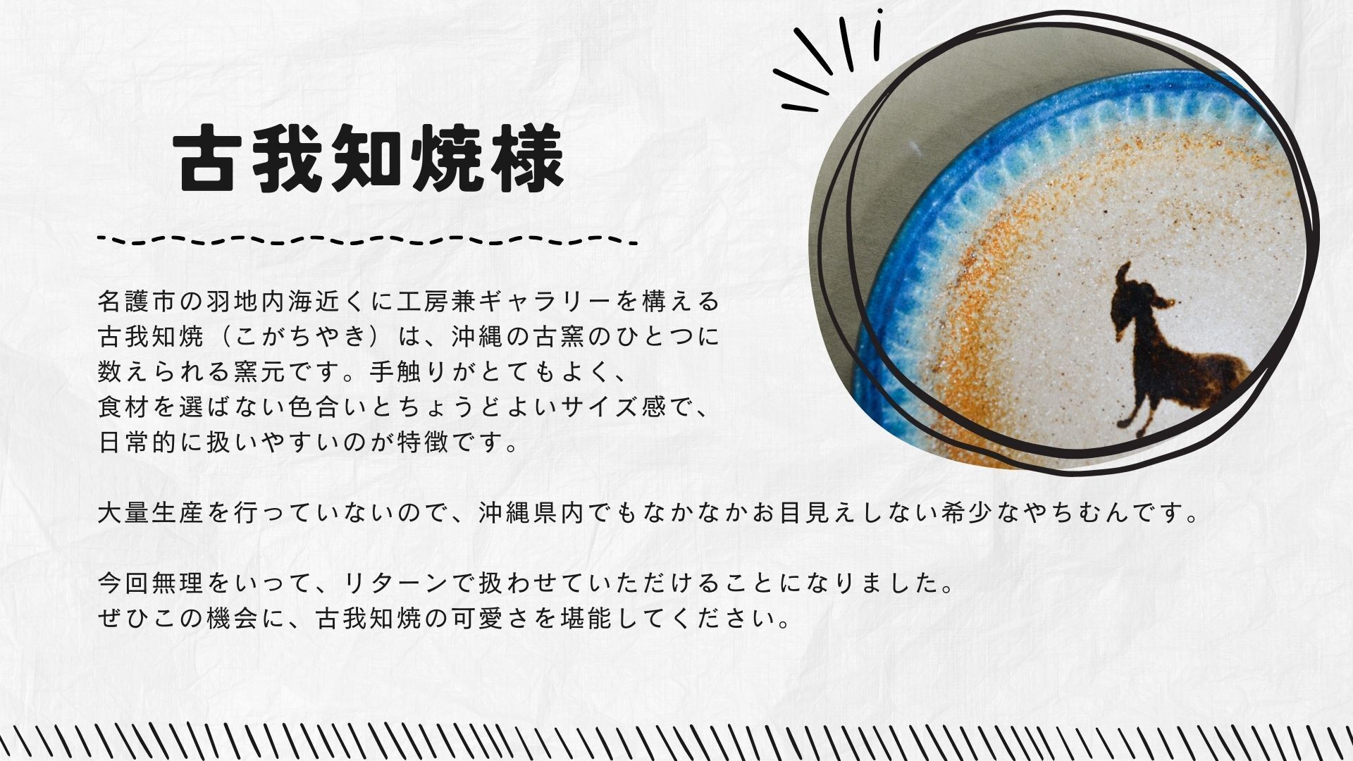 名護市に窯元を構える「古我知焼」様より、限定1セットで人気のヤギのお皿をご提供いただきました!