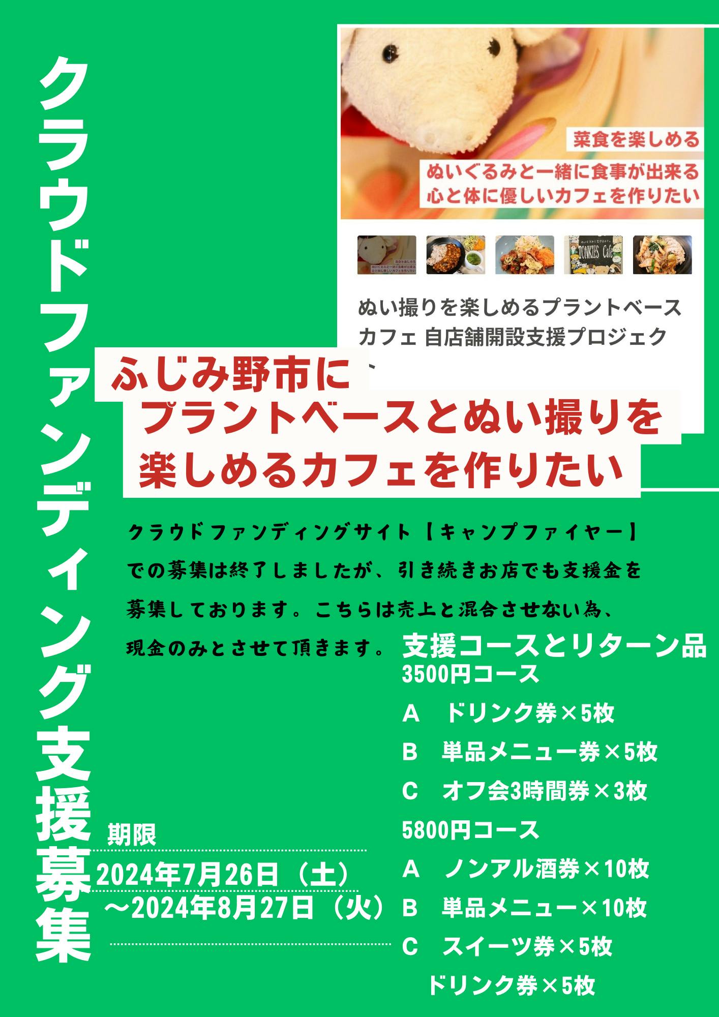キャンプファイヤーではあと少し目標には達しませんでしたので、現在営業中のお店でもご支援を受け付けております。