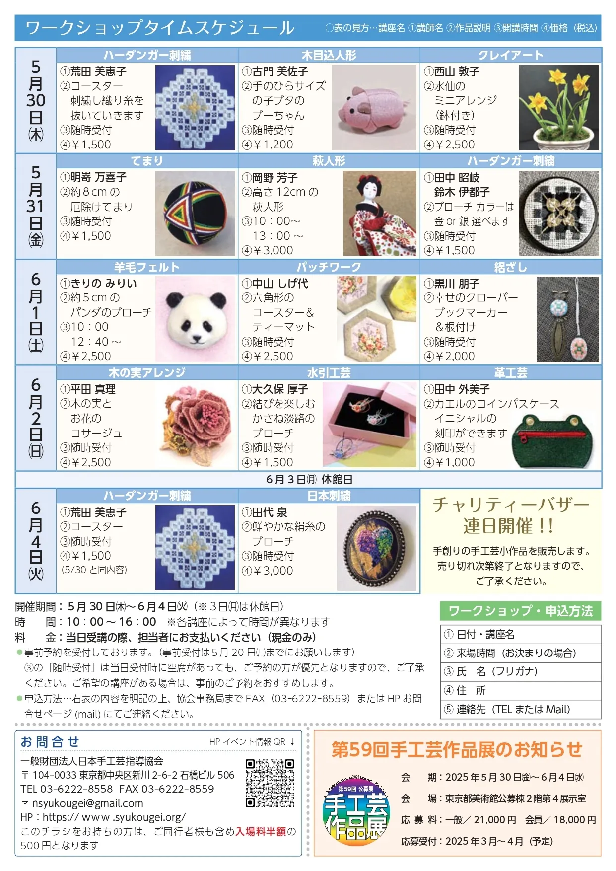 昨年の作品展では「新しい手工芸との出会い」の場をご提供できるように、会場内にてワークショップ(体験講習会)を併催し、ご好評をいただきました。今年も会期中日替わりで、13科目(伝統刺繍や欧州刺繍・てまり・パッチワーク・クレイアート・羊毛フェルトなど)のワークショップを併催予定です。