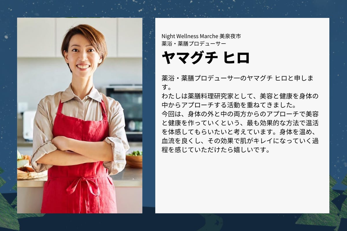 美泉夜市はそんな忙しい皆さんが手軽に立ち寄ることができる温泉スパであり、おうちでもできる温活アイテムと出会える場所にもなりたいと思っています。