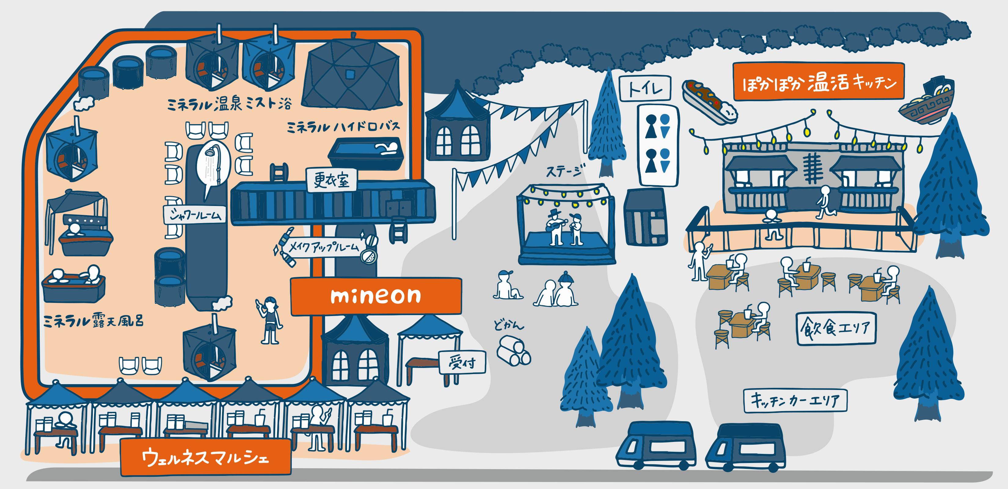内 容:ミネラル温泉スパ<mineon(ミネオン)>、美容と健康を体感できる<ウェルネスマルシェ(コスメ、飲食など、美容・健康関連商品の販売)>、スパイスや薬膳のチカラで身体の中から温める<ぽかぽか温活キッチン>