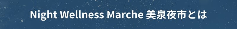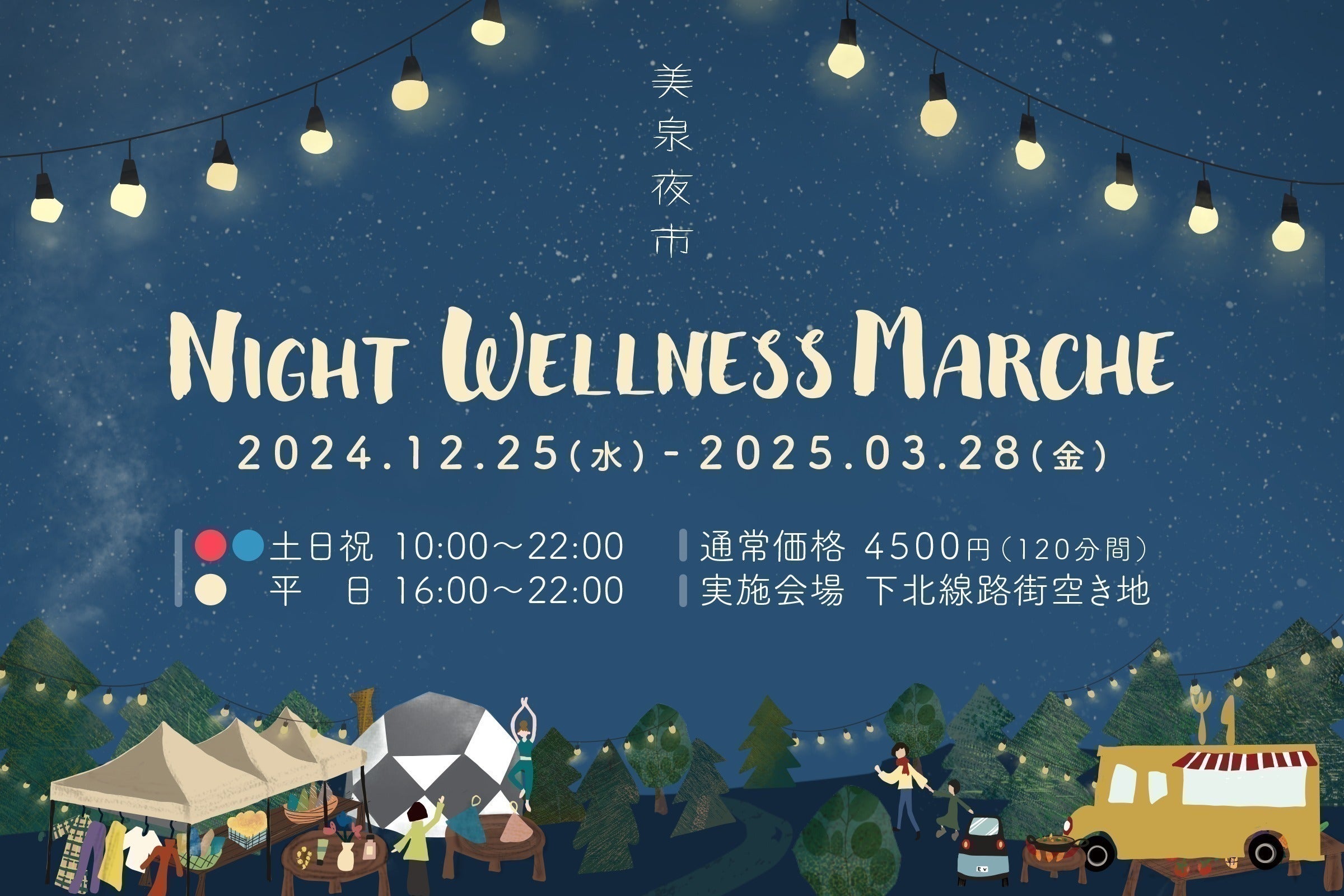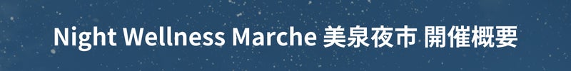Night Wellness Marche 美泉夜市は、ミネラル温泉スパでしっかり身体の隅々まで温まり、身体を中からもぽかぽかにする温活フードを楽しみ、その日から始められる温活アイテムがゲットできる「行くだけでまるっと温活できる、ミネラル温泉スパ施設」です。
