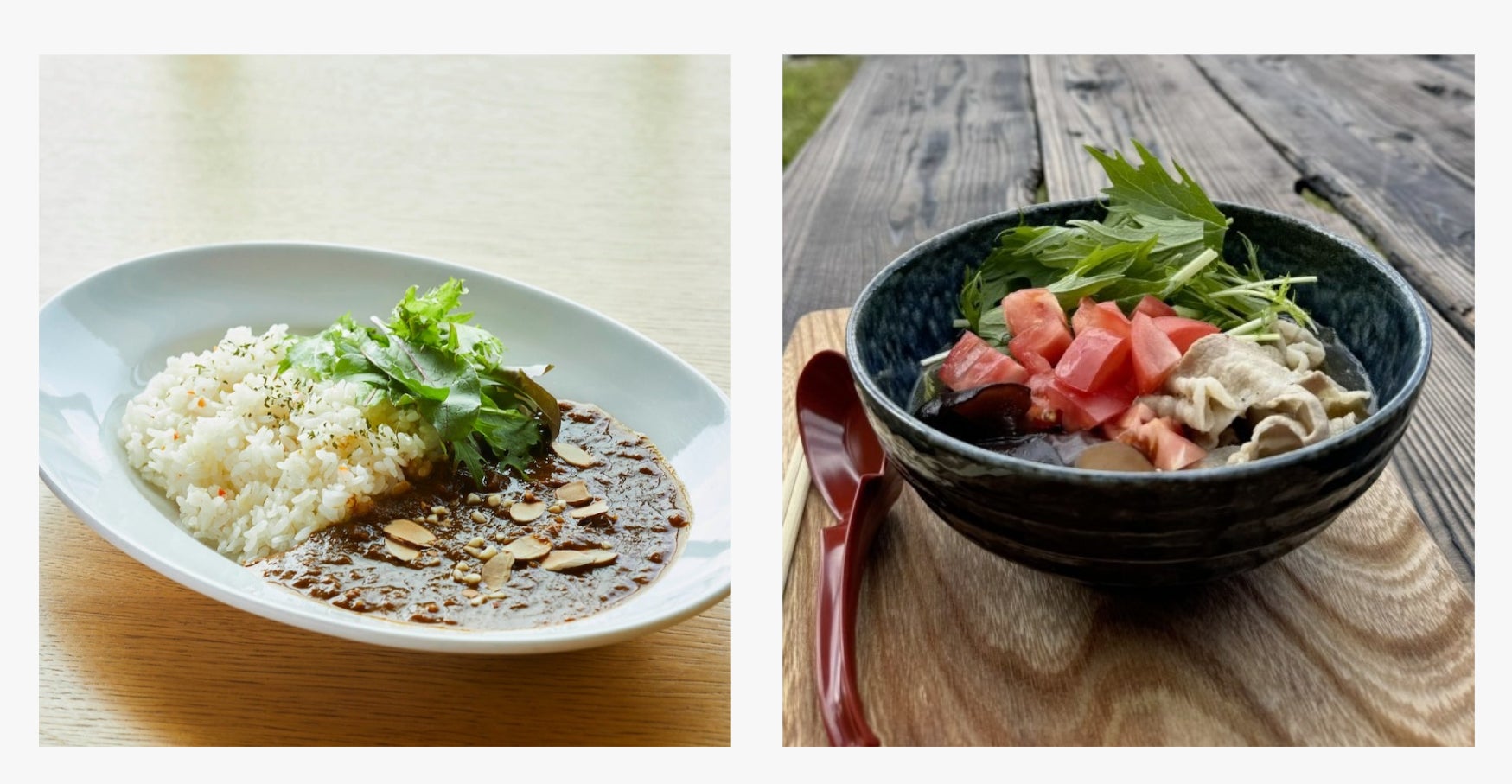 左より、「ハチドリ 薬膳温活ヴィーガンカレー」「<美泉夜市>限定サ飯マーラータン」