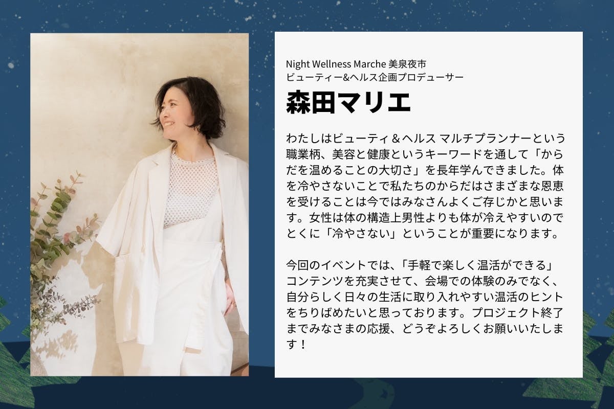 美泉夜市はそんな忙しい皆さんが手軽に立ち寄ることができる温泉スパであり、おうちでもできる温活アイテムと出会える場所にもなりたいと思っています。