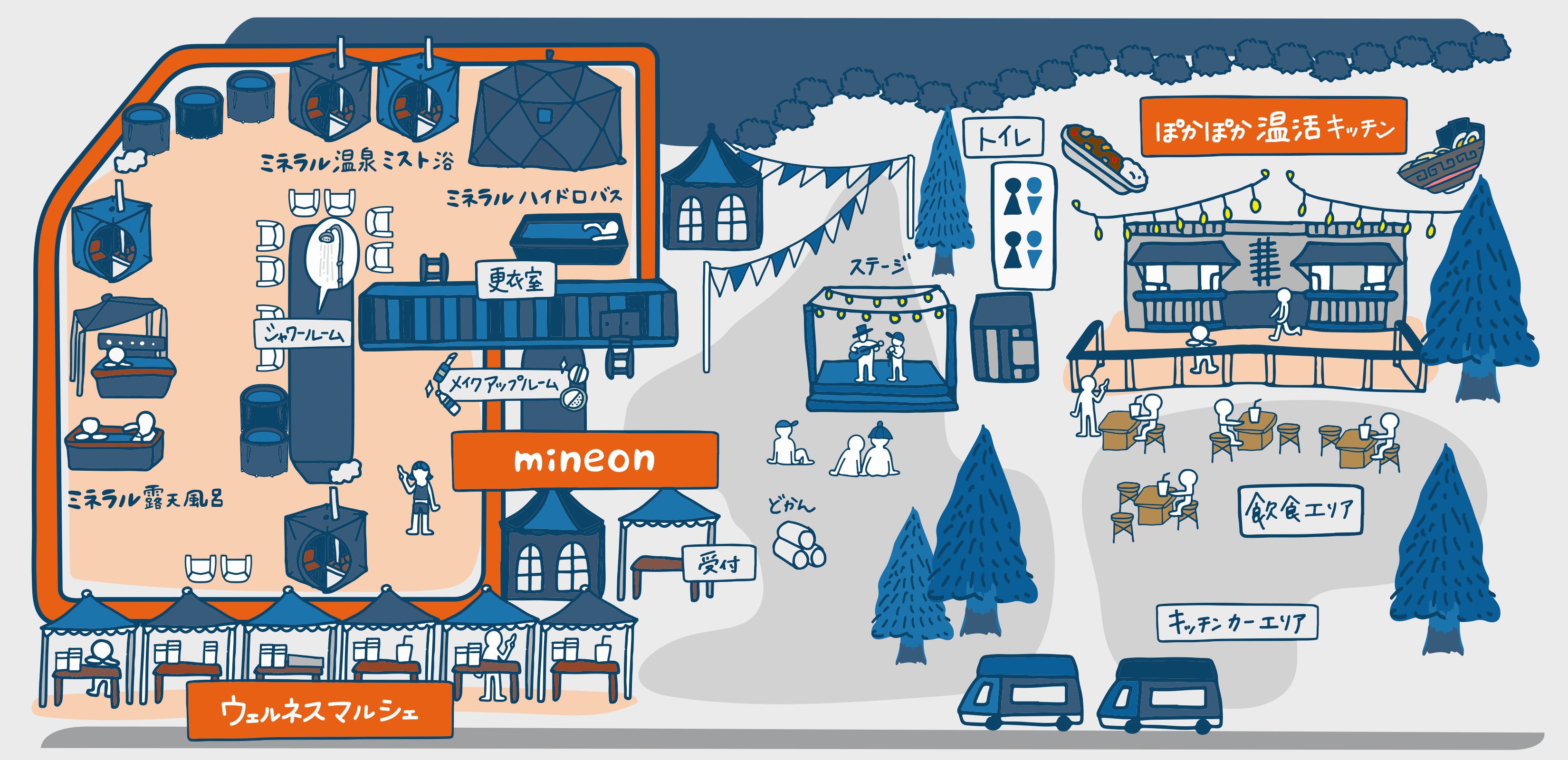 内 容:ミネラル温泉スパ<mineon(ミネオン)>、美容と健康を体感できる<ウェルネスマルシェ(コスメ、飲食など、美容・健康関連商品の販売)>、スパイスや薬膳のチカラで身体の中から温める<ぽかぽか温活キッチン>