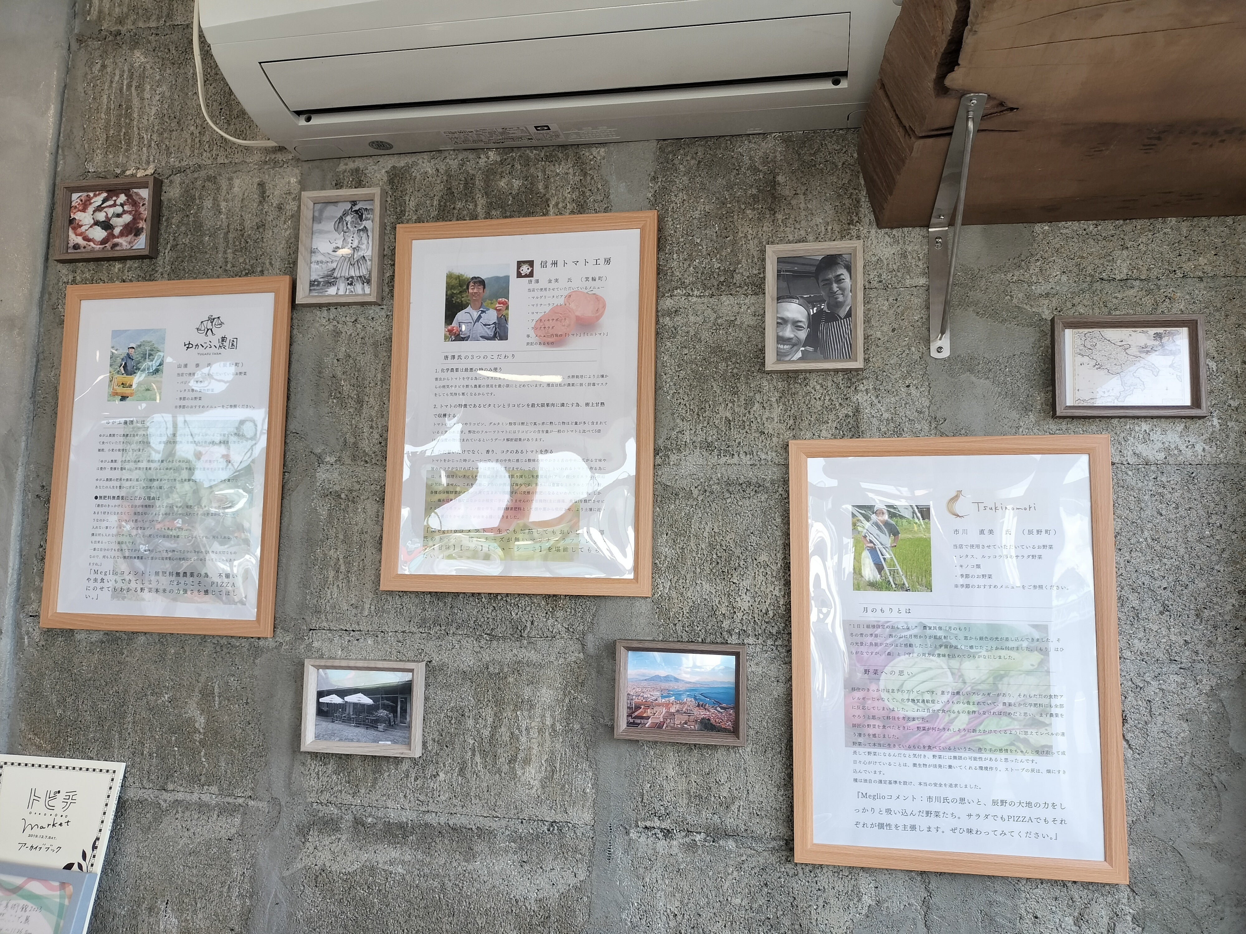 店内の壁には、お店で使わせてもらっている野菜の生産者さんをご紹介しています!他にもシェフの師匠やイタリアの写真も。小さい店内ですが、ぜひ壁も見てみてください!