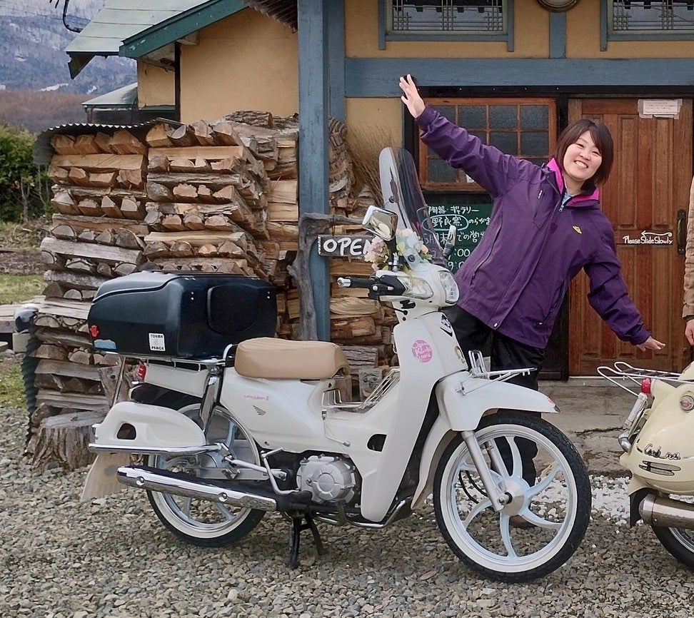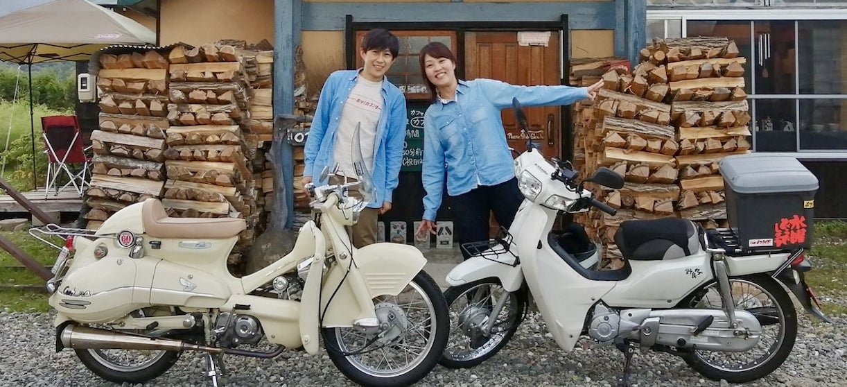 夫:昭博、妻:有希子。どちらもバイク乗りで、今はHONDAのカブシリーズに乗っています!