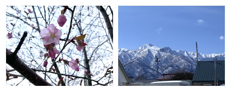 (左)2024年4月25日、桜が咲きました! (右)3月下旬のモトリョカンからの景色。気温は20度もあった日!