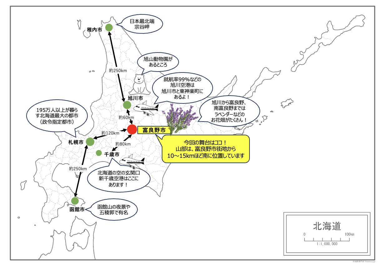 今回の舞台となる「富良野(ふらの)市」は、北海道の真ん中、「へそのまち」。