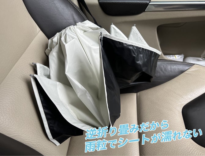 雨天時の折りたたみの際に便利な「逆折り畳み構造」を採用することで、使い勝手をさらに増しています。逆折り畳み構造の利点として、雨天使用時に折り畳んだ際、雨水が外側についていないことがあげられます。傘についた雨粒でシートや車内、カバンの中などがびしょびしょにならずに済むことはとても大きなメリットと言えます。