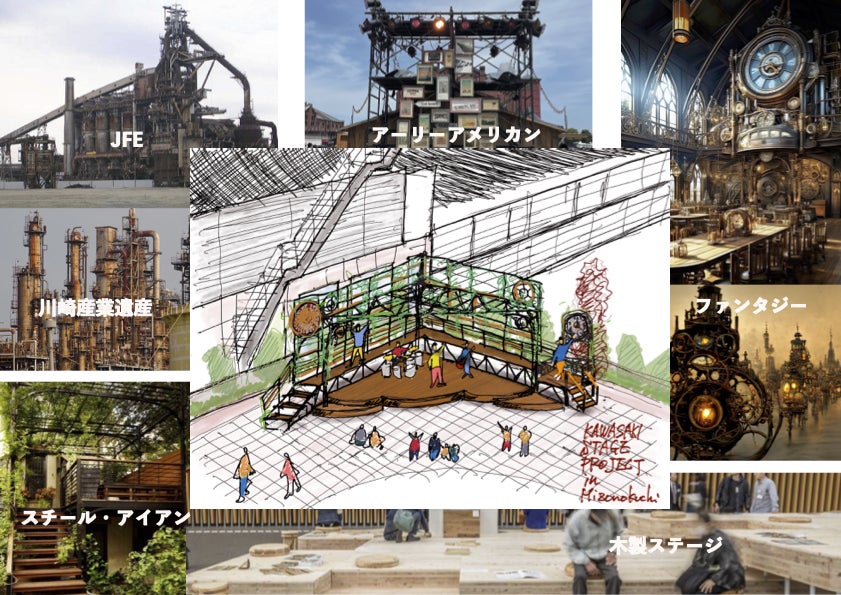 ラフスケッチがあがってきました!!お〜〜〜!!きたーーー〜〜〜!!リクエストしたのは・・・*木製のステージ*スチール・アイアン*植栽*川崎産業遺産*アーリーアメリカンそして*ファンタジーう〜〜〜む!! イメージが膨らむ 膨らむ!!いい感じ!