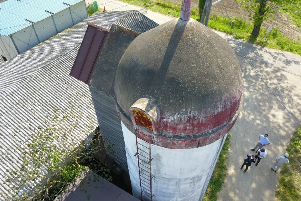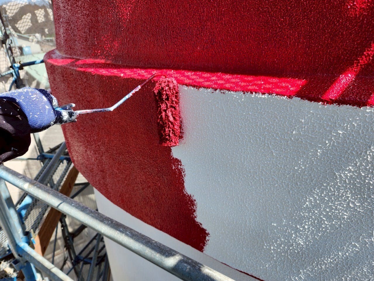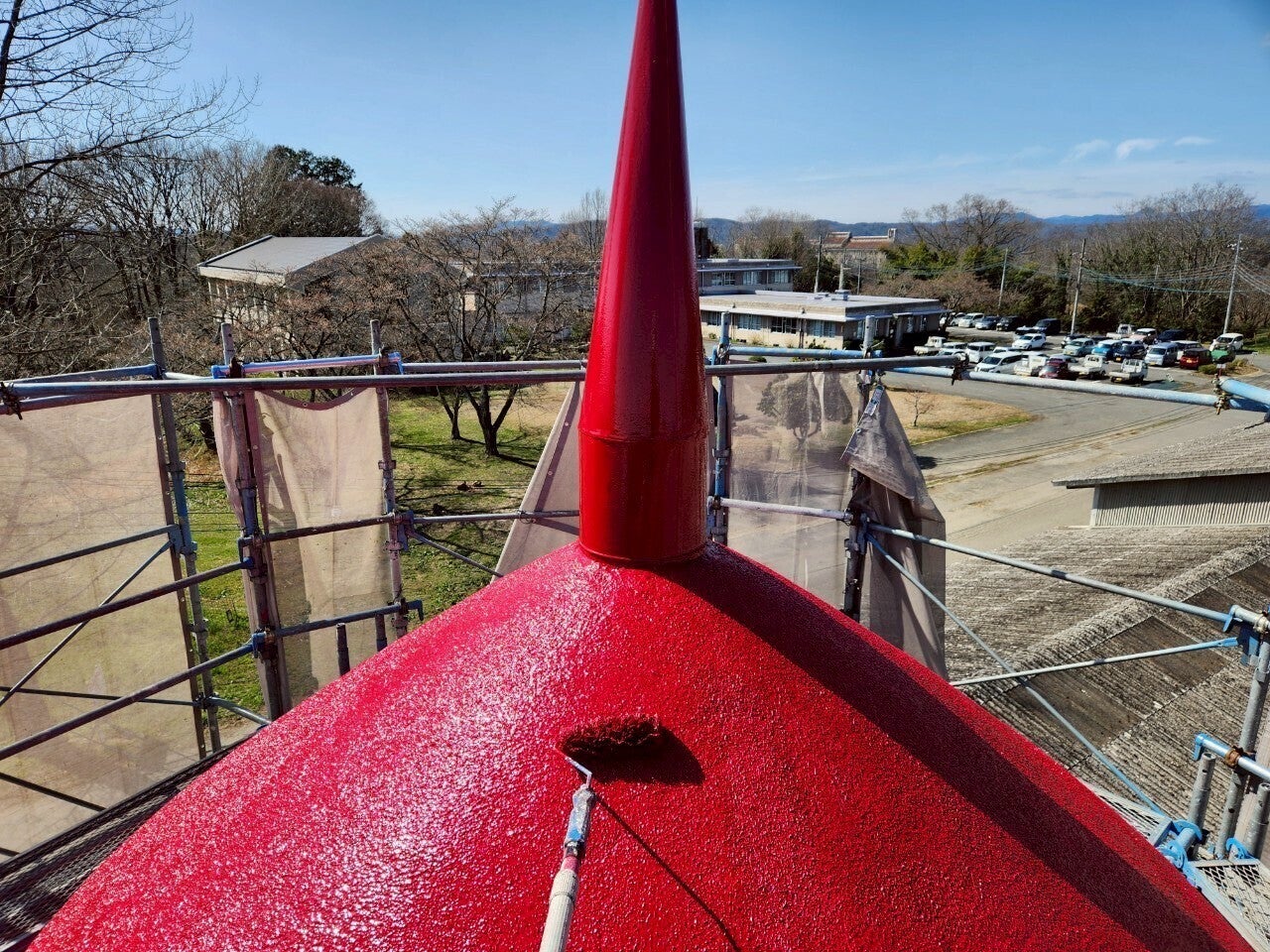 赤いサイロの足場工事が終わり、洗浄から下地塗りを経て、ついに赤い色が塗られています。