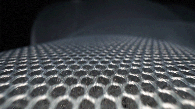 ハチの巣のような編み目形状の少し厚みのある立体構造で、風を通すための通気性を確保しながら、座ったときの心地よさを実現しています。