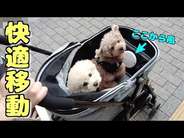 2匹のトイプードルのワンちゃんが、ペットカート+ペットクーラーファンシートで、外出を楽しんでいる様子が中心に映されています。