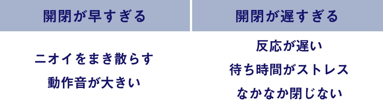 開閉スピードが早すぎても遅すぎてもニオイ漏れの原因となります。