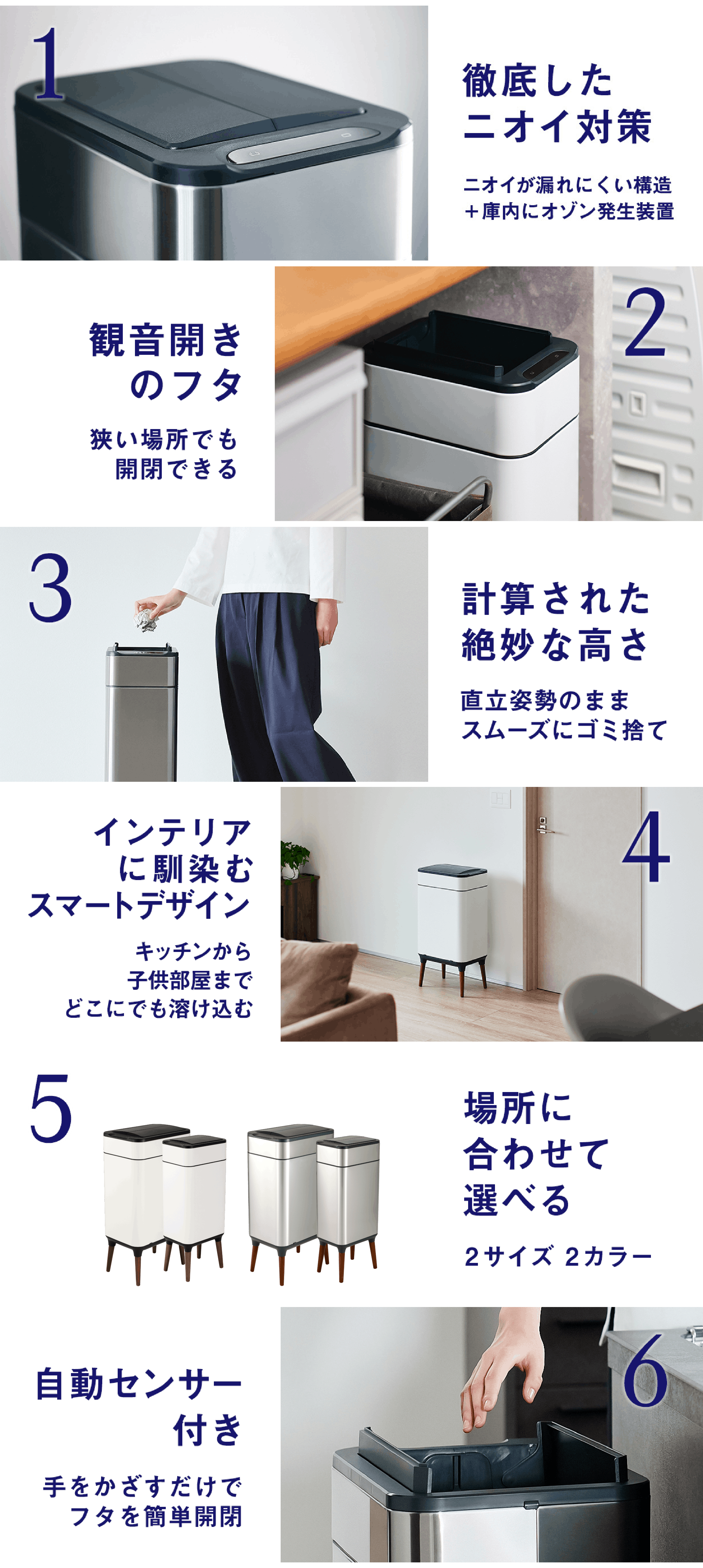 ニオイを漏れにくくする開閉スピードと開放時間、またストレスなく捨てられるセンサーの感知時間にもこだわりました。