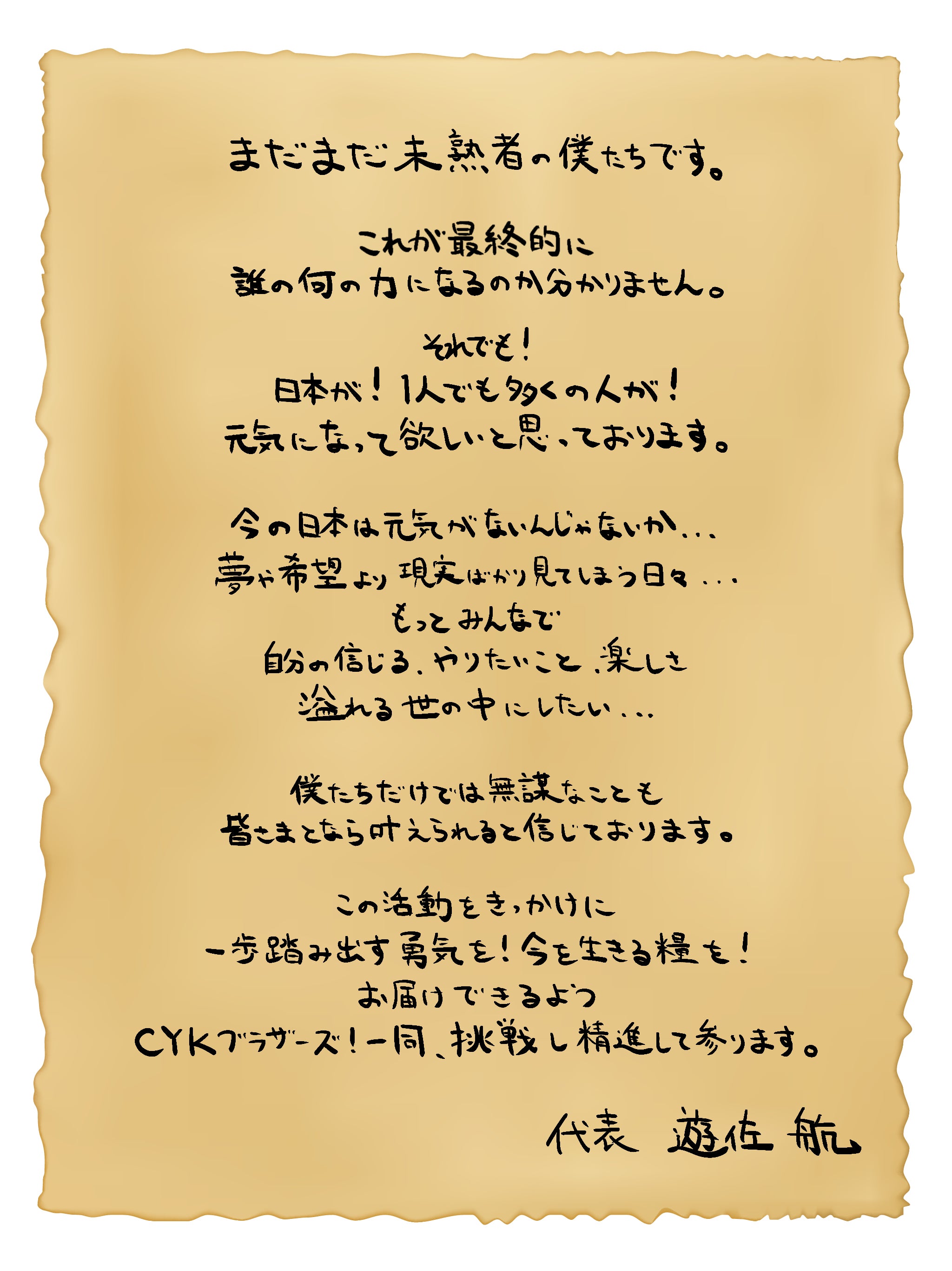 エンタメがもつ力に魅了され、俳優として各々で活動を行っていた僕たち。コロナ禍の中、それぞれが自分達の不甲斐なさを痛感し、このままでは…と奇遇にも同時期に所属事務所を退所。一度共演をした以来、再共演はなくとも交友が続き、親友と呼び合う仲だった僕たちは、引き合うようにして、自分達の大好きな"エンターテイメント"を再確認し合い、皆さまに楽しんでいただける"自分たちのエンタメ"を届けたいと考えるようになり、紆余曲折あり2024年1月1日より《CYKブラザーズ!》として活動を開始しました。
