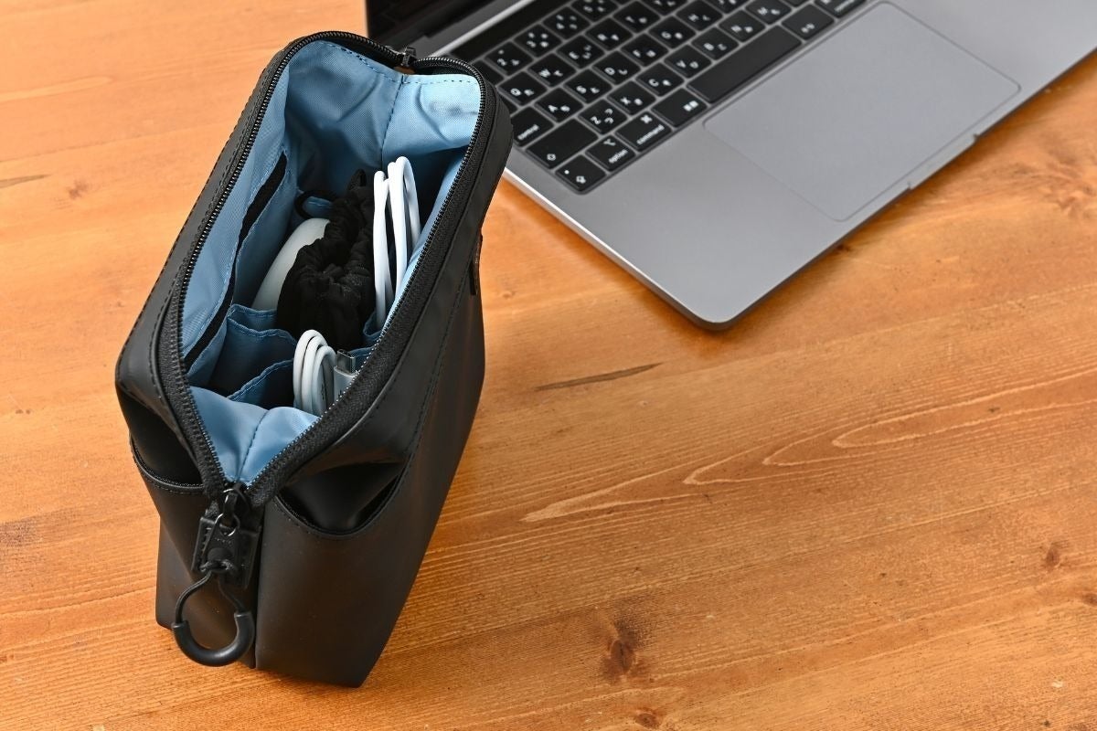 ポーチを開けたままでも安定して立て置けるので、場所をとらずにアイテムをスムーズに出し入れできます。