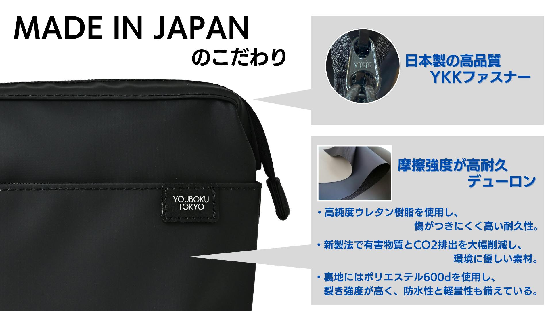 ファスナーは日本製のYKKファスナーを使用しています(※撥水効果はありません)。