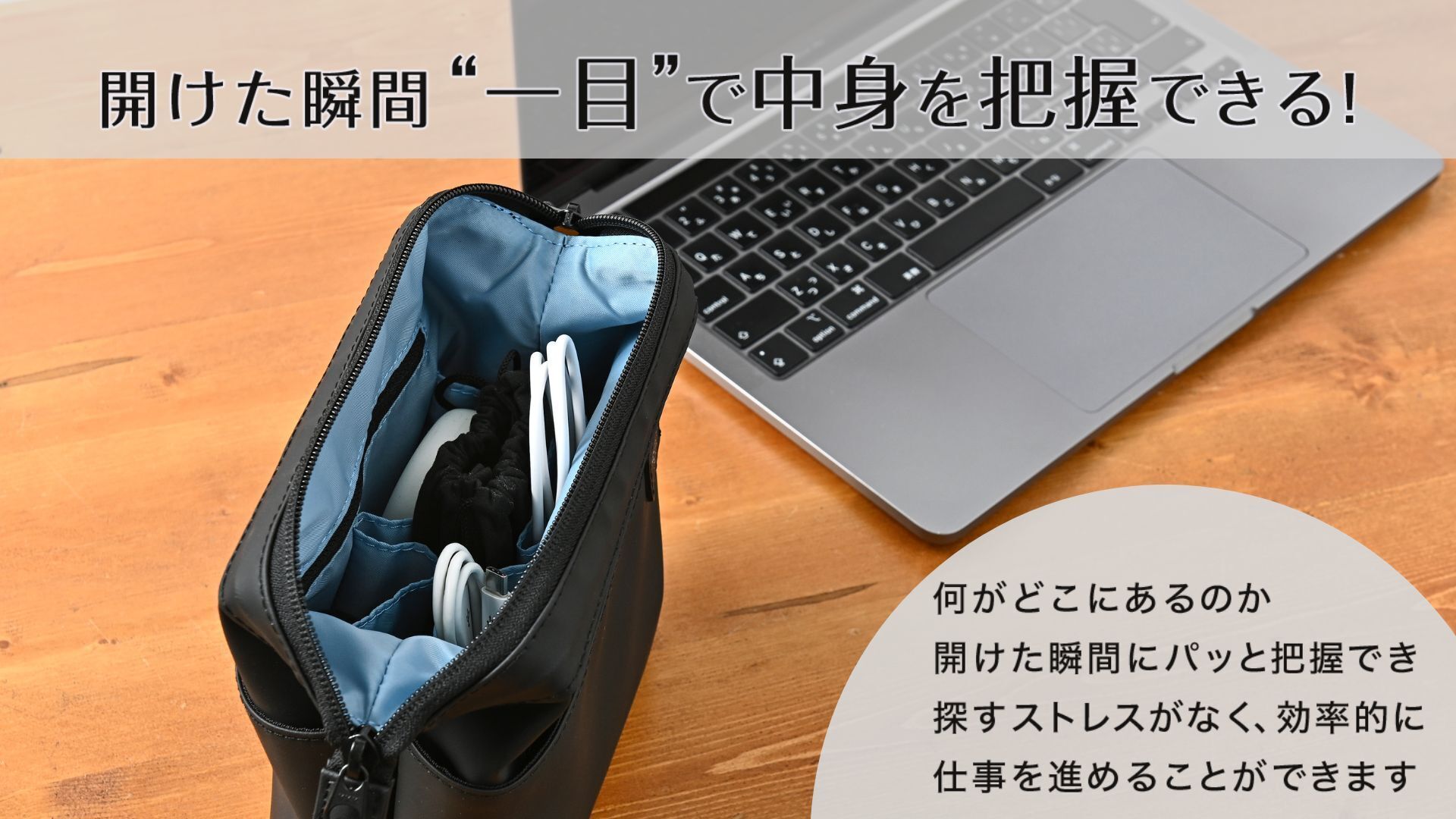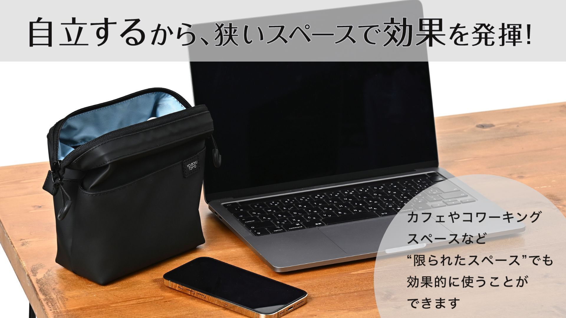 ポーチを開けたままでも安定して立て置けるので、場所をとらずにアイテムをスムーズに出し入れできます。