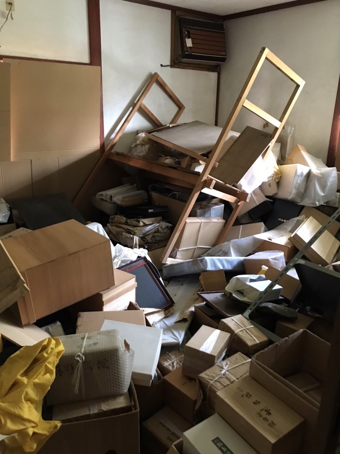 店舗の状態。棚やガラスケースが倒れ、非常に散らかった状態になってしまいました。
