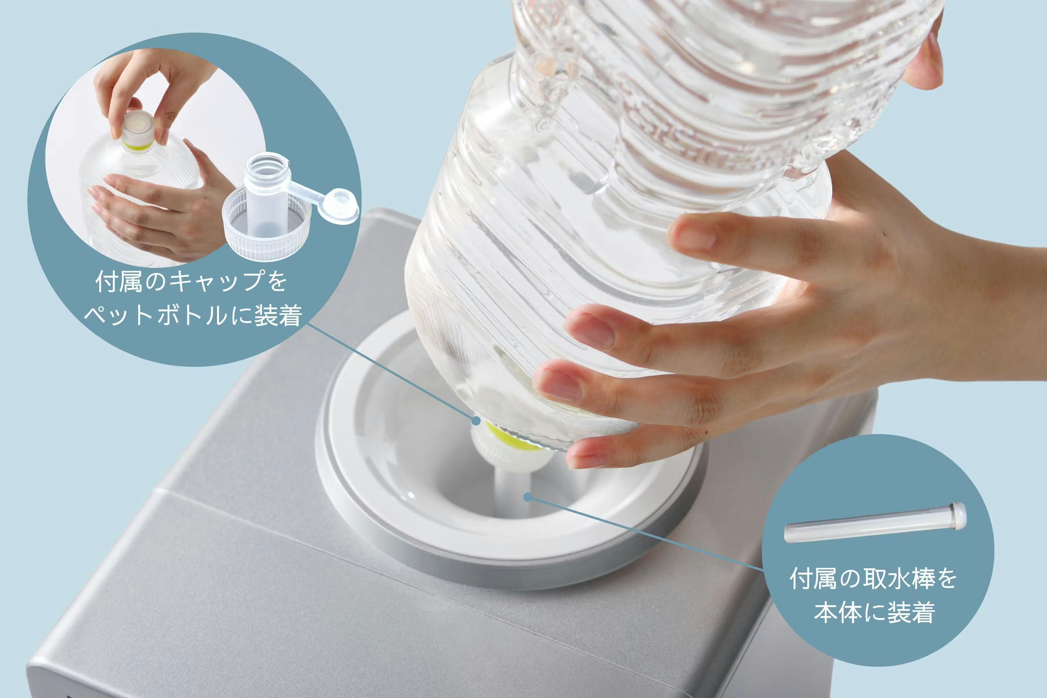 市販のペットボトル専用のウォーターサーバーだから、「いつもの」ペットボトルのお水をそのまま使って頂けます。レンタル型のウォーターサーバーの宅配ボトルで量が多く感じている方にとっておすすめです。