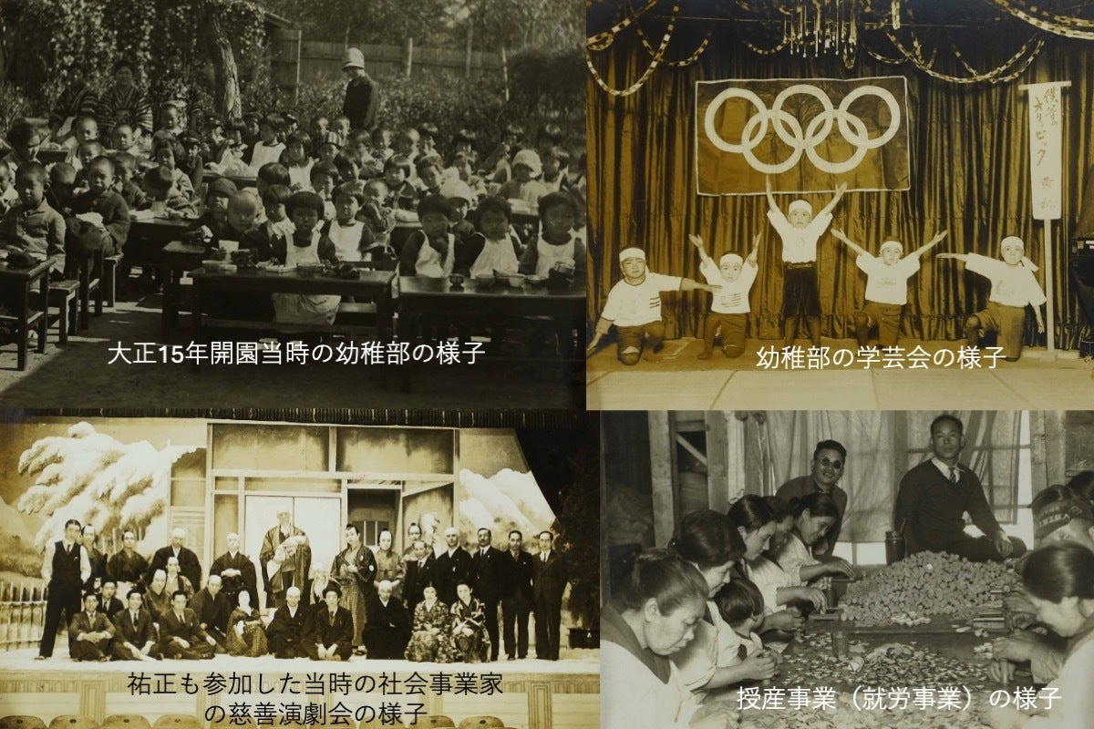 祐正は1926年にイギリスのセツルメントにならい施設を「善隣館」と名付け、当時地位の低かった女性の授産事業(就労支援事業)、夜間洋裁学校、そのこどもたちのお世話をする幼稚部、小学生学童保育、中学生学童保護、図書室、芸術や憩いの場など地域の人々の暮らしぶりが良くなるための施設を作りました。