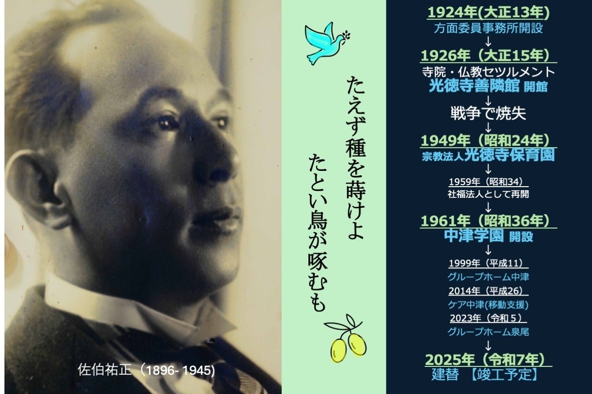 ※善隣館開設前の1924年に、方面委員事務所(現在の民生委員)を中津町役場から光徳寺に移した年を福祉事業を始めた年としています。