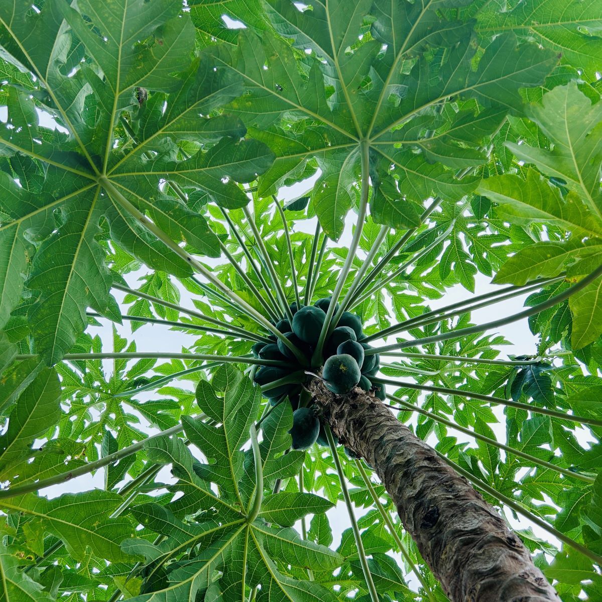 自生したパパイヤの樹。自然のみの力で成長し台風にも耐えて100個以上の実をつけてくれてます(現在も収穫中)