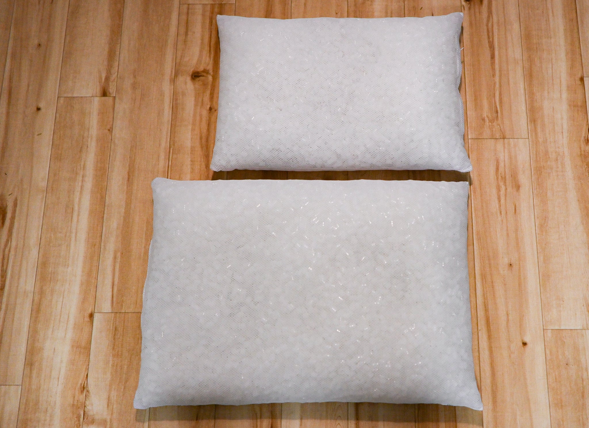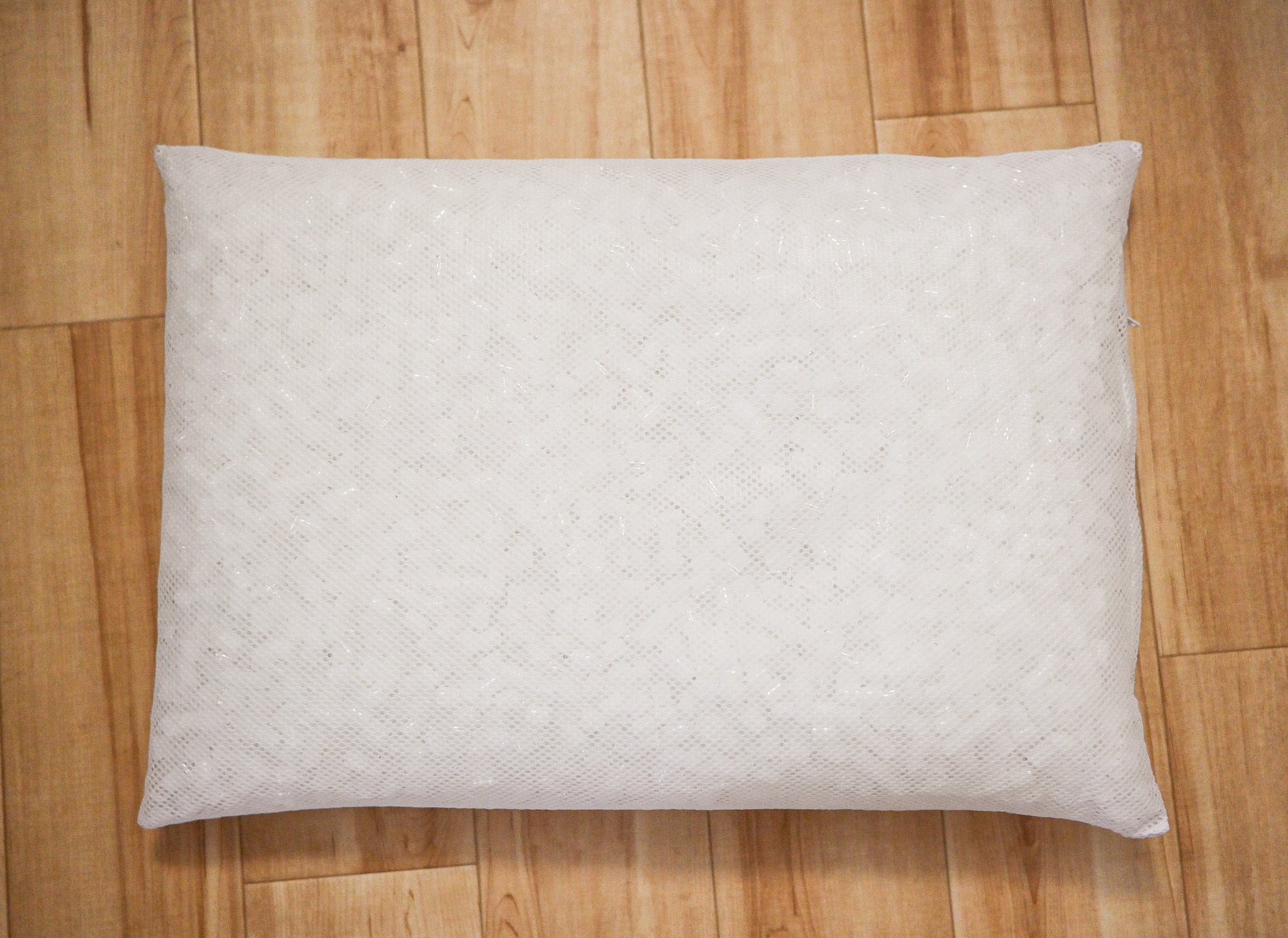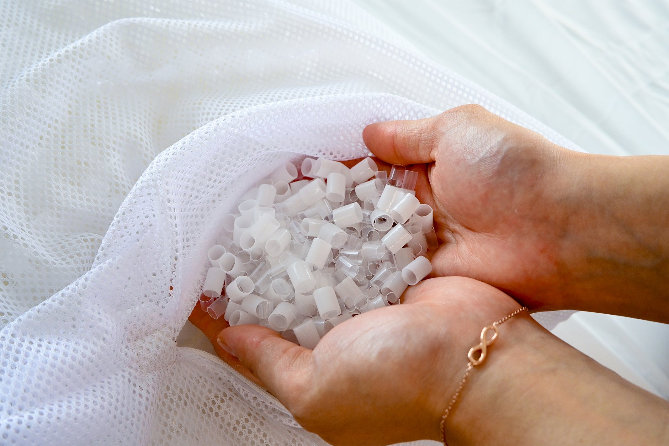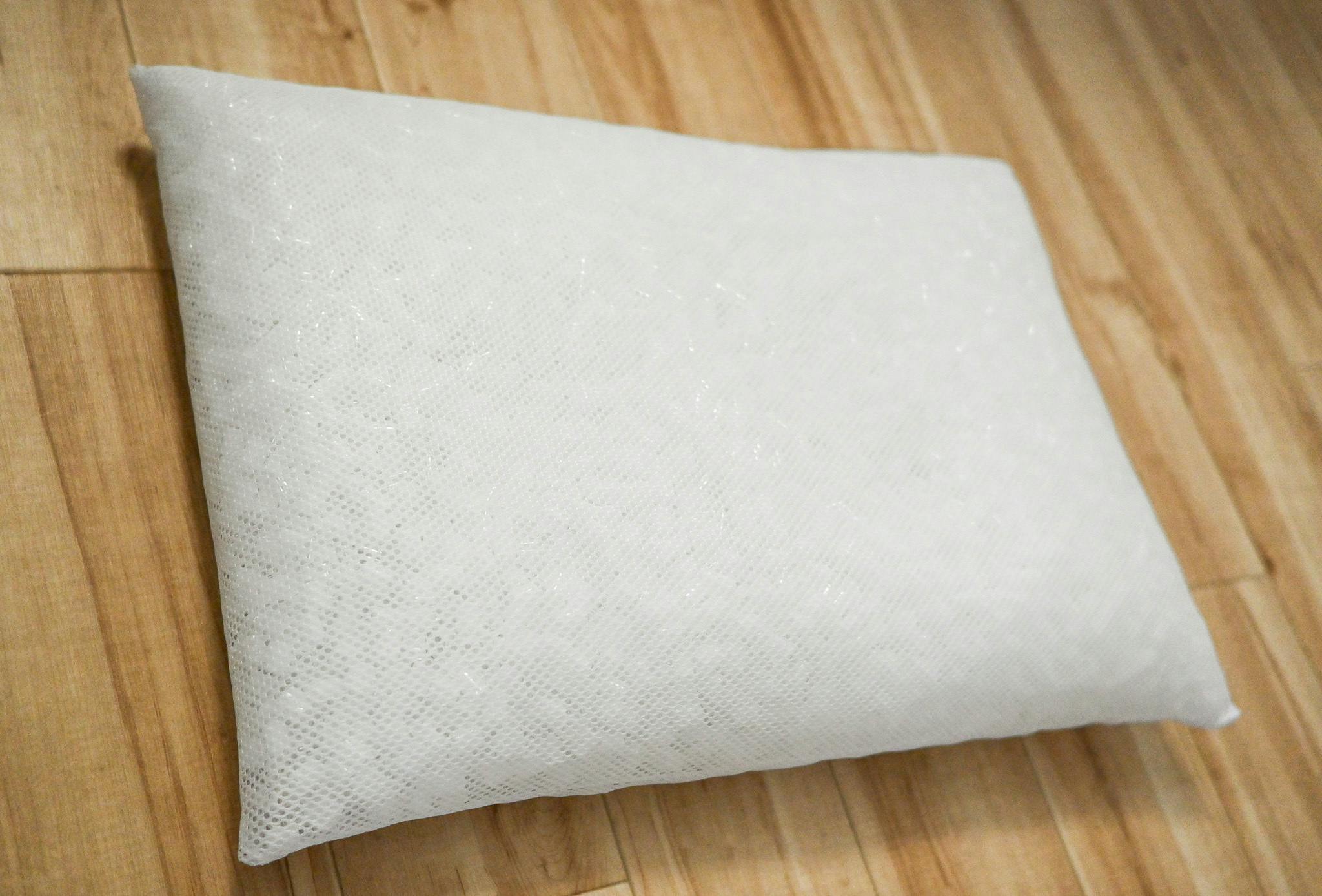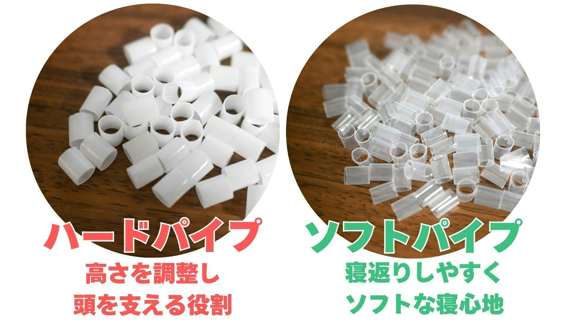 整体枕DEEP1.0の中材はウレタンではなく、異なる柔らかさの複数種類のパイプ材を組み合わせたもの。