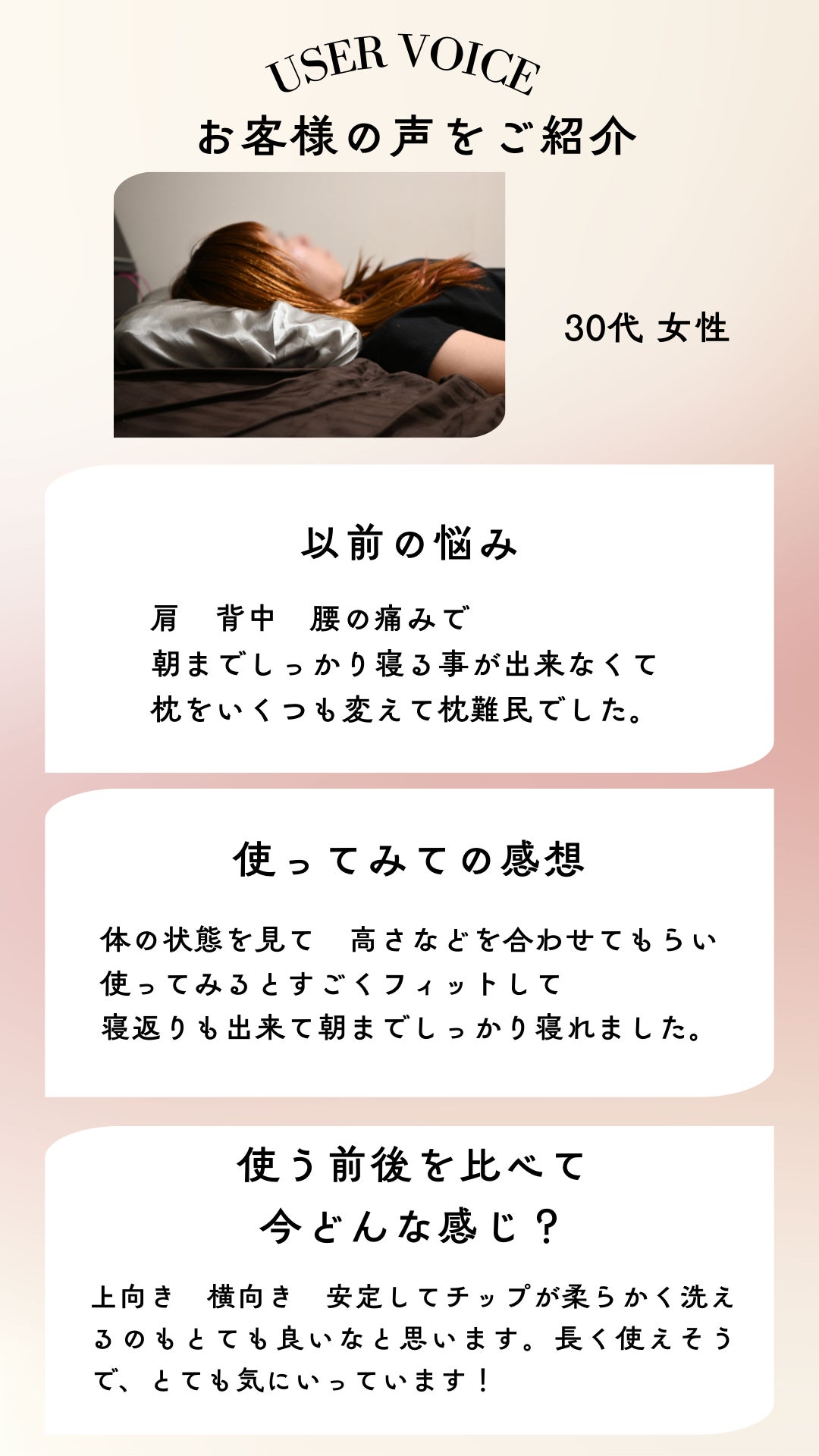 「ヒアリングシートの回答だけでピッタリになるの?」と思われるかもしれませんが、身長体重などのある程度の情報と、今の就寝環境や首元のお写真などをいただければこれまでの施術経験から予測は十分に可能です。ぜひオンライン診断を受けるような感覚でオーダーください。