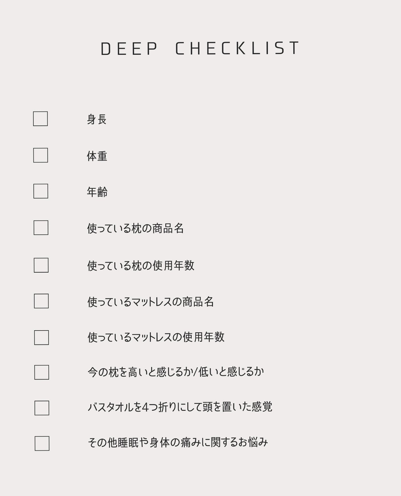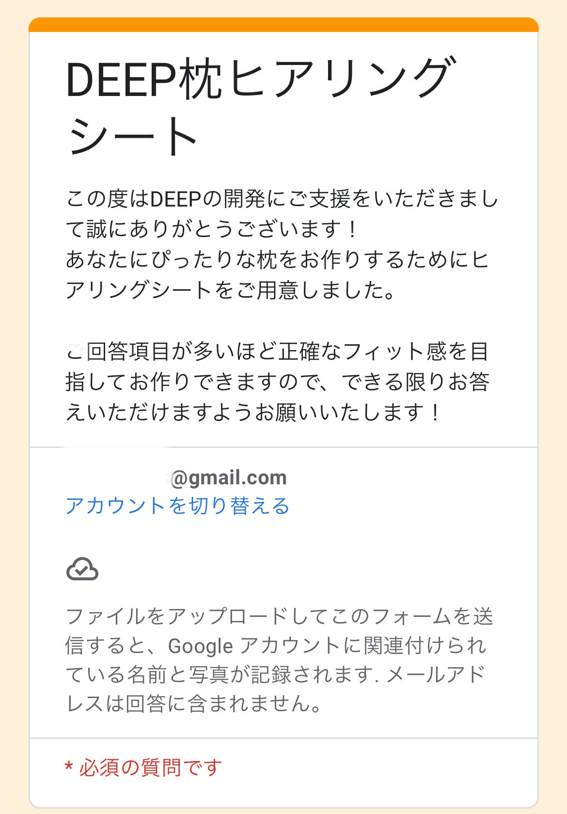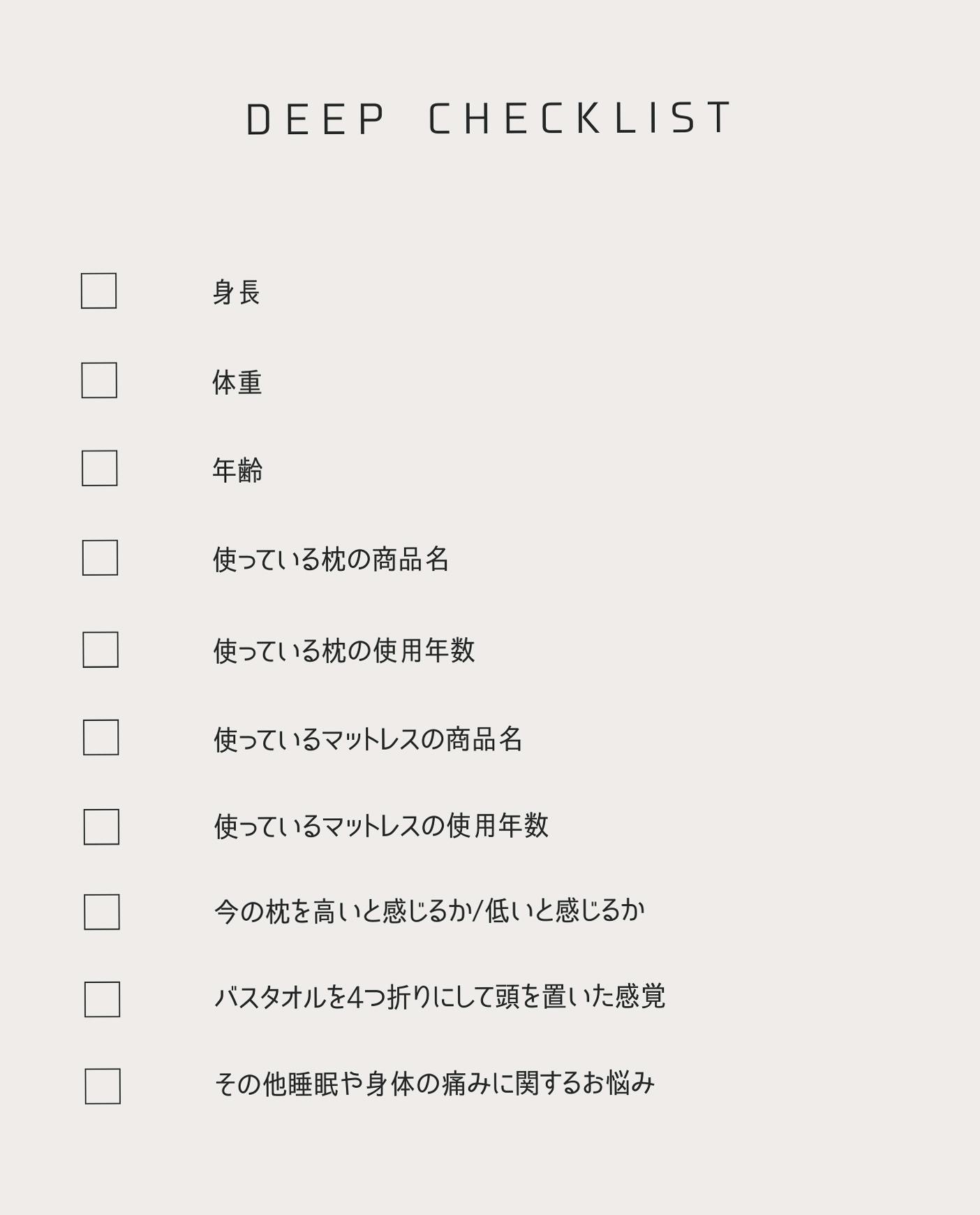 ヒアリング項目は必須のものと任意のものがございますが、より正確にあなただけの枕をお届けするために可能な限りお答えいただけますと幸いです。